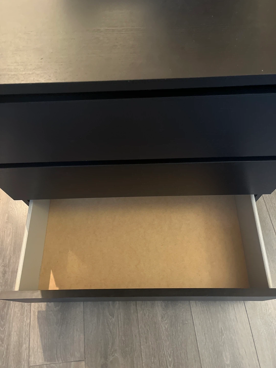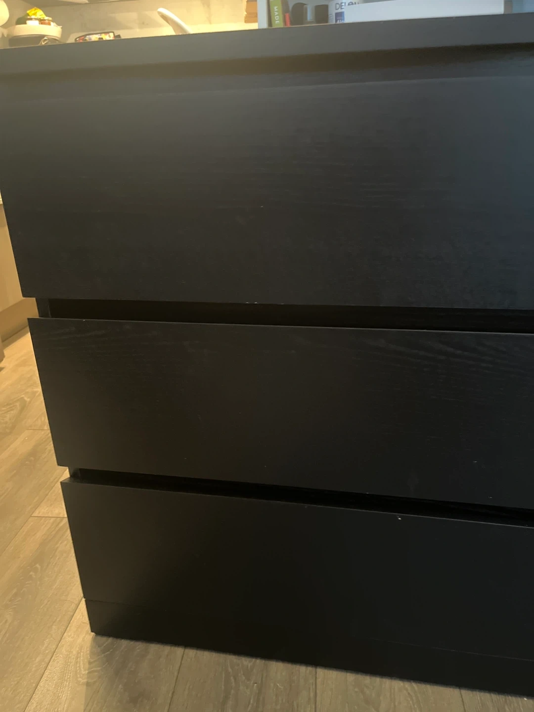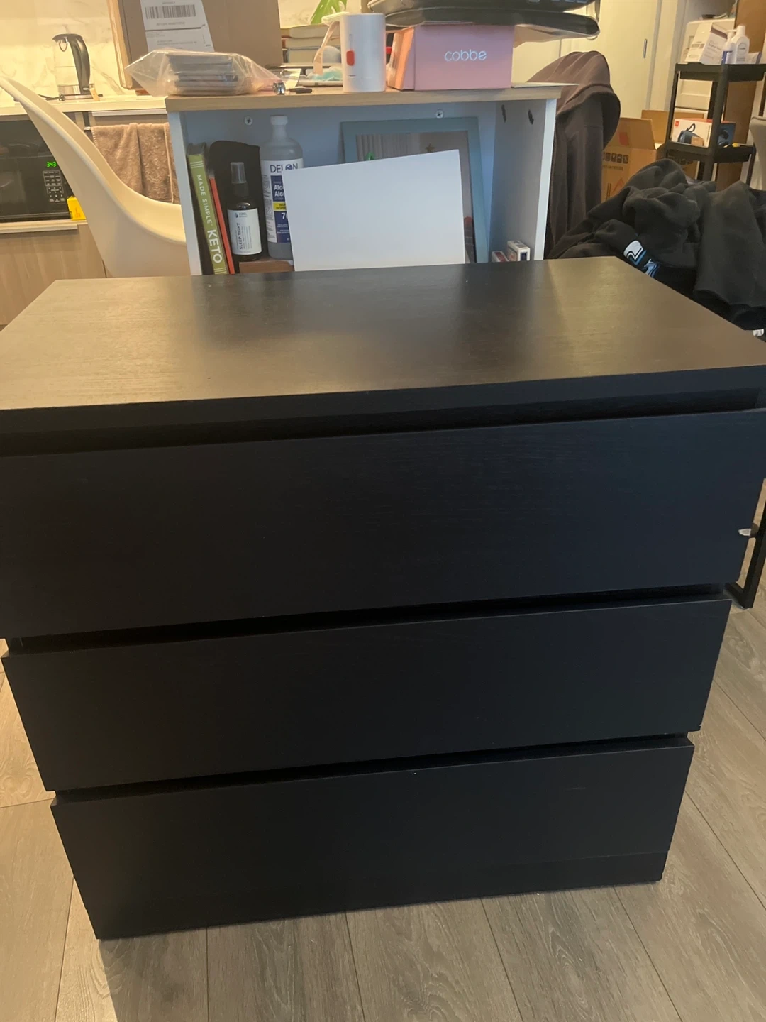 Selling a dark brown IKEA three-drawer dresser. It has a few scratches, as shown in the photos. It's a great piece for extra storage in a bedroom or closet!