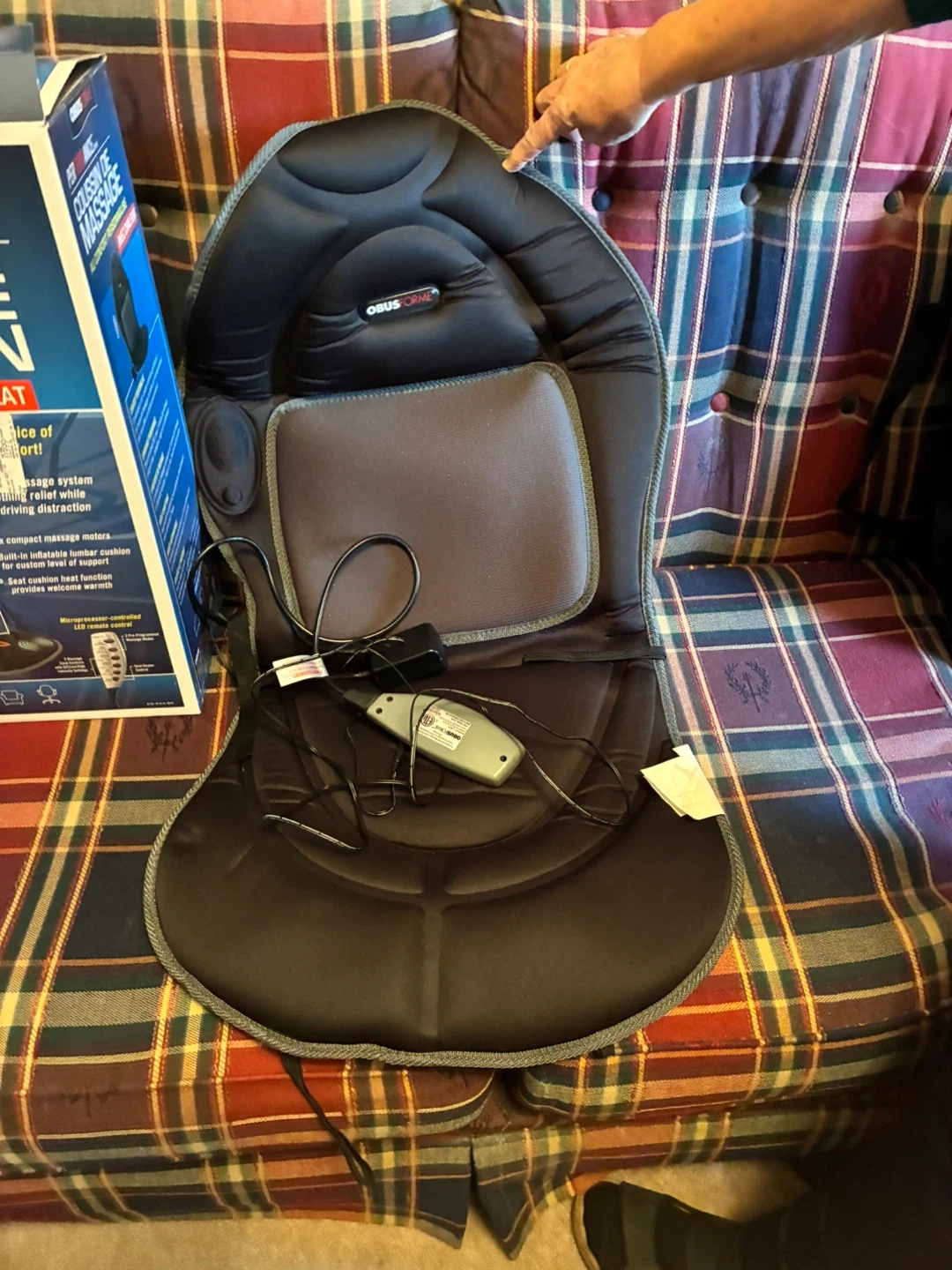 This Obusforme massage cushion offers personalized comfort with multiple massage modes and heat. It features a vibrating massage system for neck and back relief, six compact massage motors for custom support, and LED indicators. Includes remote for easy control and welcoming warmth.