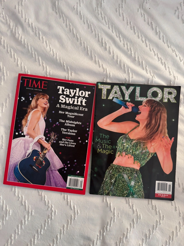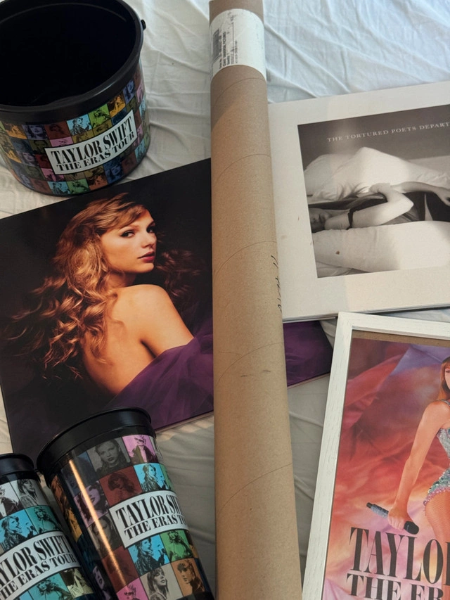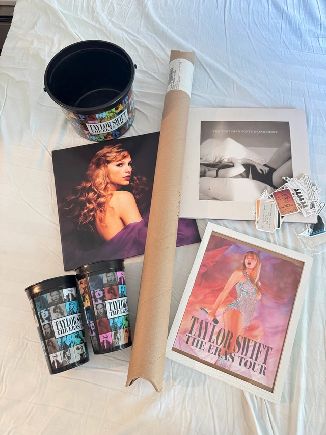 This Taylor Swift lot includes a variety of items for any Swiftie! The lot contains: Official Cineplex never opened Poster for the 2023 released of The Eras Tour plus the collectible one on frame. The Tortured Poet Department vinyl, Era's tour merch from Cineplex, Speak now Vinyl, two Taylor Swift Time Magazine covers, and more as seen in the photos. All of these items are in excellent condition. I will add my bag worth about $80 bucks of beads for friendship bracelets. Everything is available if this advertisement is still up! I am moving so I’m sadly letting go of my collection.