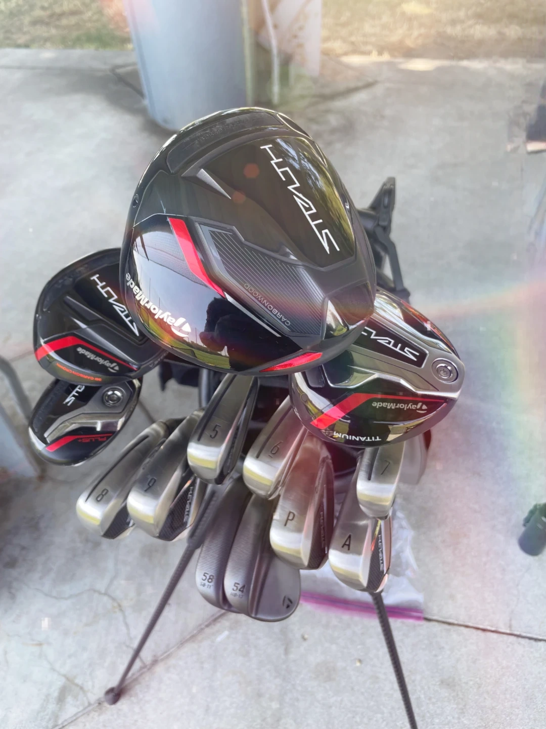 75Selling a set of TaylorMade Stealth golf clubs. Includes various irons (5, 6, 8, 9, P, A, 54, 58) and woods. The Stealth driver features Carbonwood technology. A great set for any golfer!