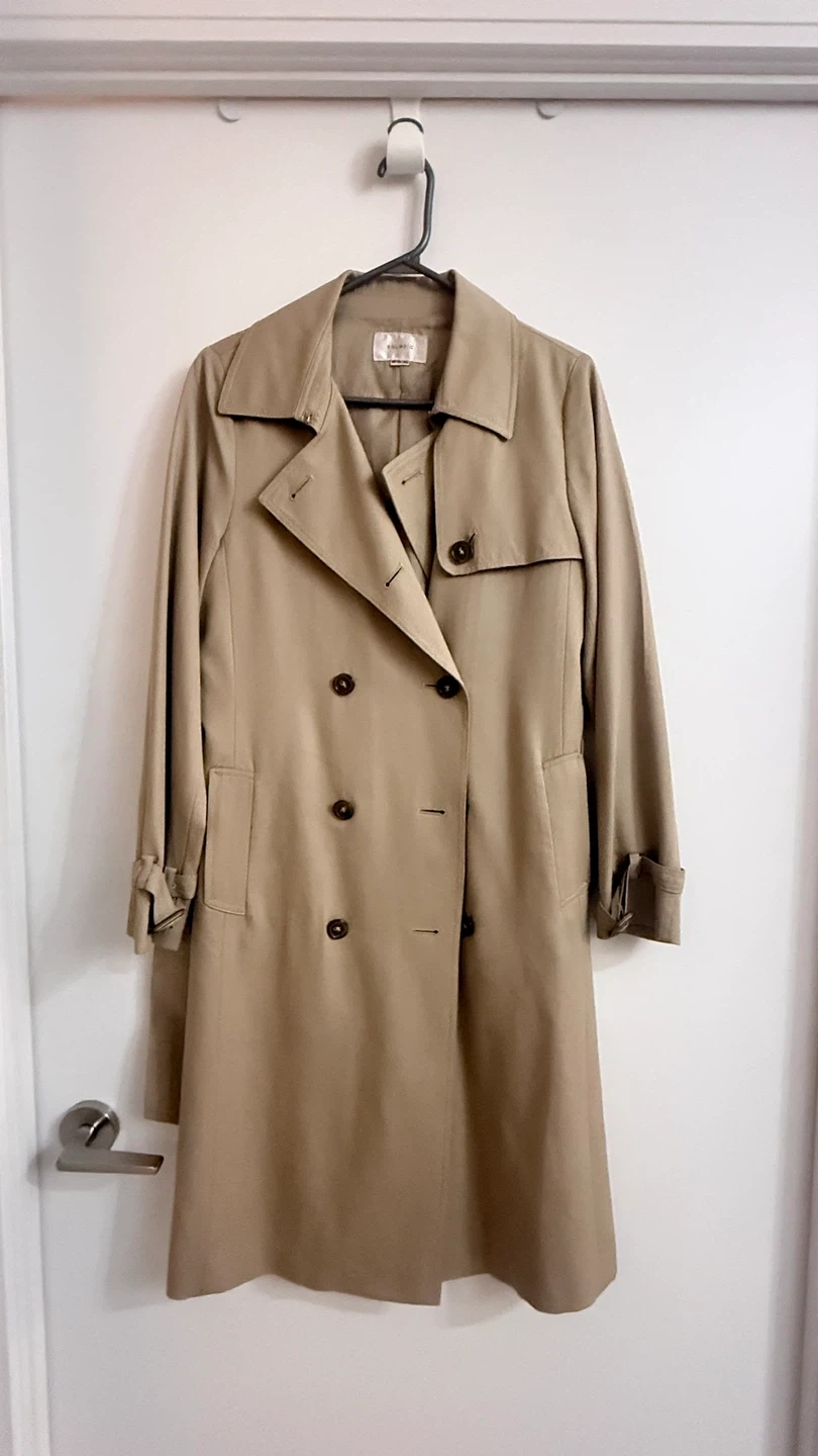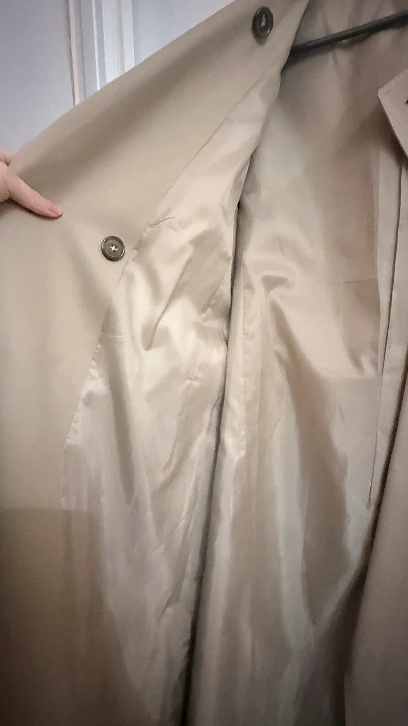 This is a classic beige trench coat from Solezia. It's a double-breasted style with button closures. The lining is a silky beige material.