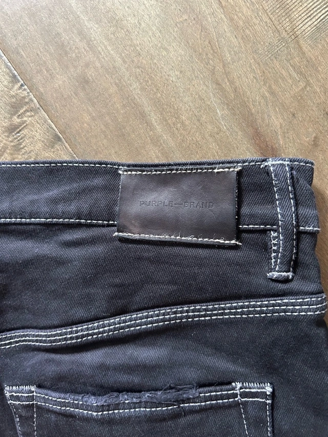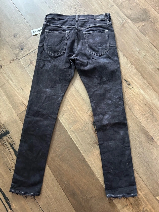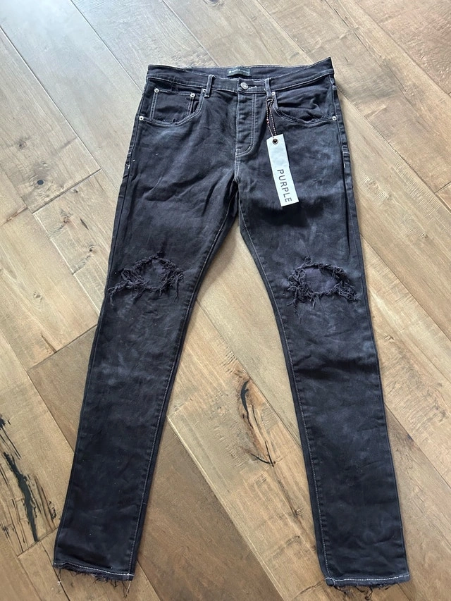 These are a stylish pair of Purple Brand distressed jeans, perfect for adding an edgy touch to your wardrobe. These jeans feature a slim fit, distressed details at the knees, and a unique wash that gives them a vintage look. They are in new condition with tags attached. Additional features include: * Slim fit * Distressed knees * Unique wash * Size 34 I'm asking $135 because they're in great condition and still have the tags!