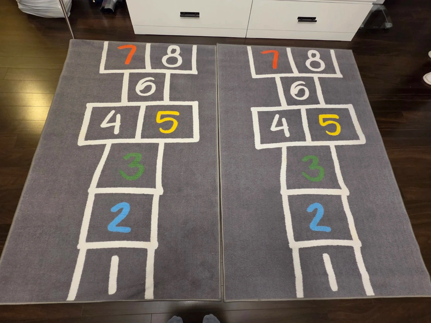 This play mat rug features a classic hopscotch design with numbers 1 through 8. It's a fun addition to any child's ( or pets) play area. The mat is grey with white lines and colourful numbers.