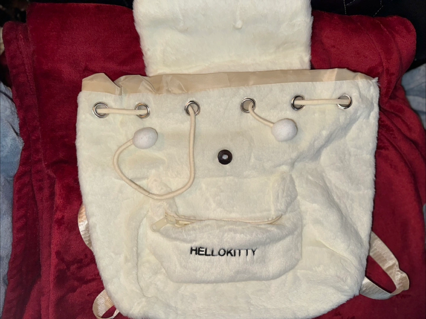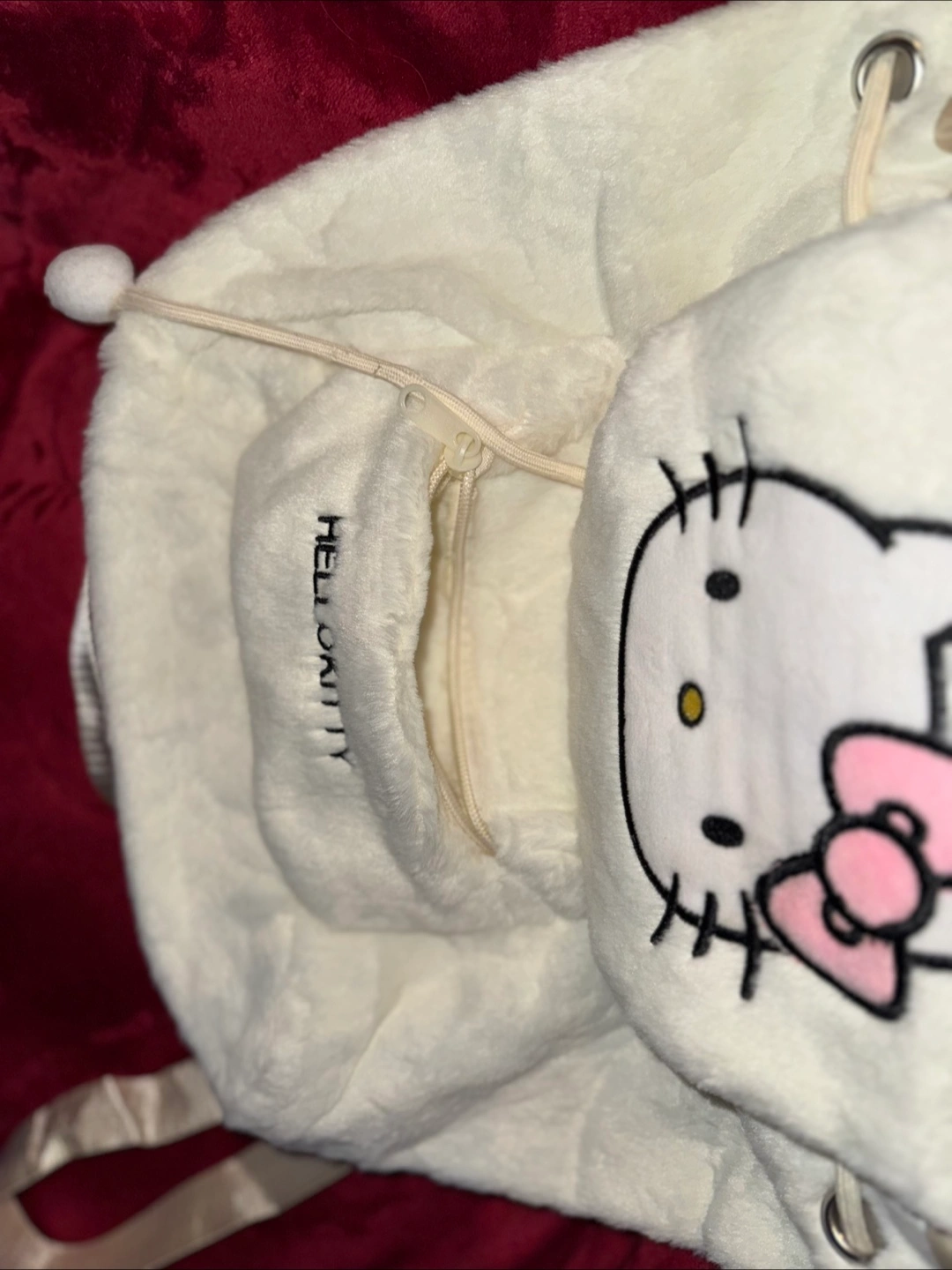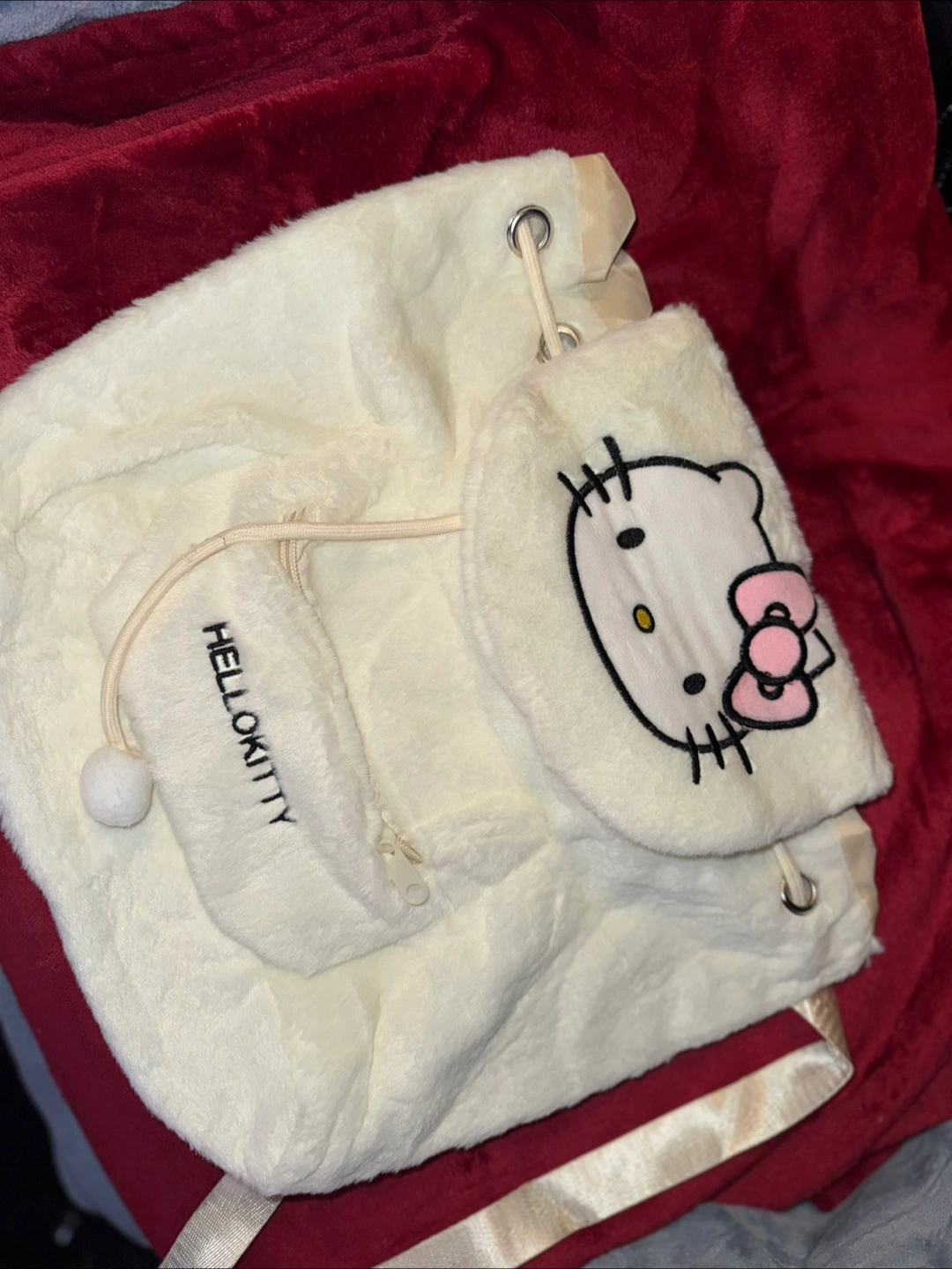 Adorable backpack. White plush material. Features the well known and loved Hello Kitty character. Decently sized it’s able to hold a laptop and books along with a few other items. Drawstring closure with a magnet clasp to hold it shut. Zippered front pocket. Adjustable straps.