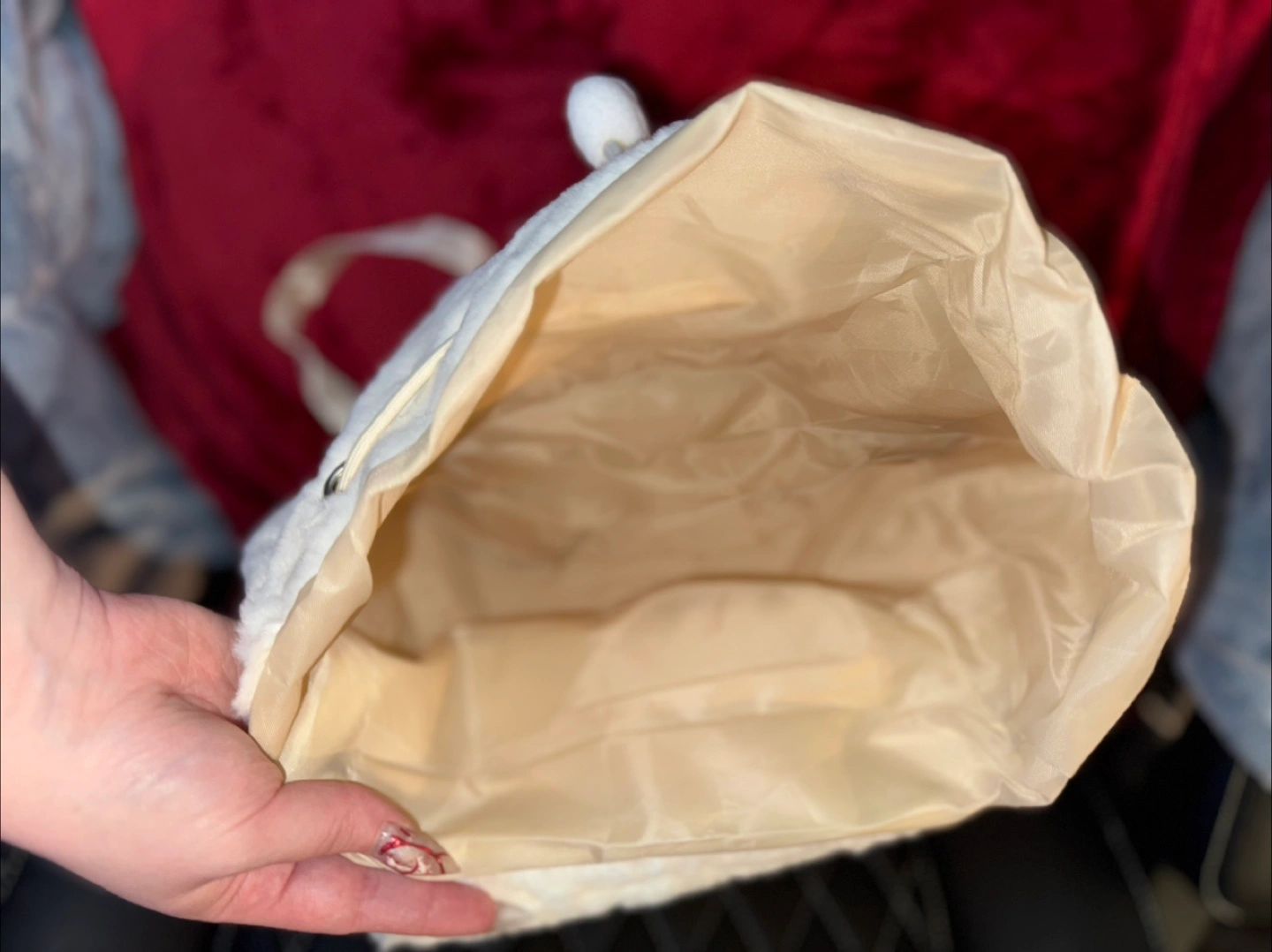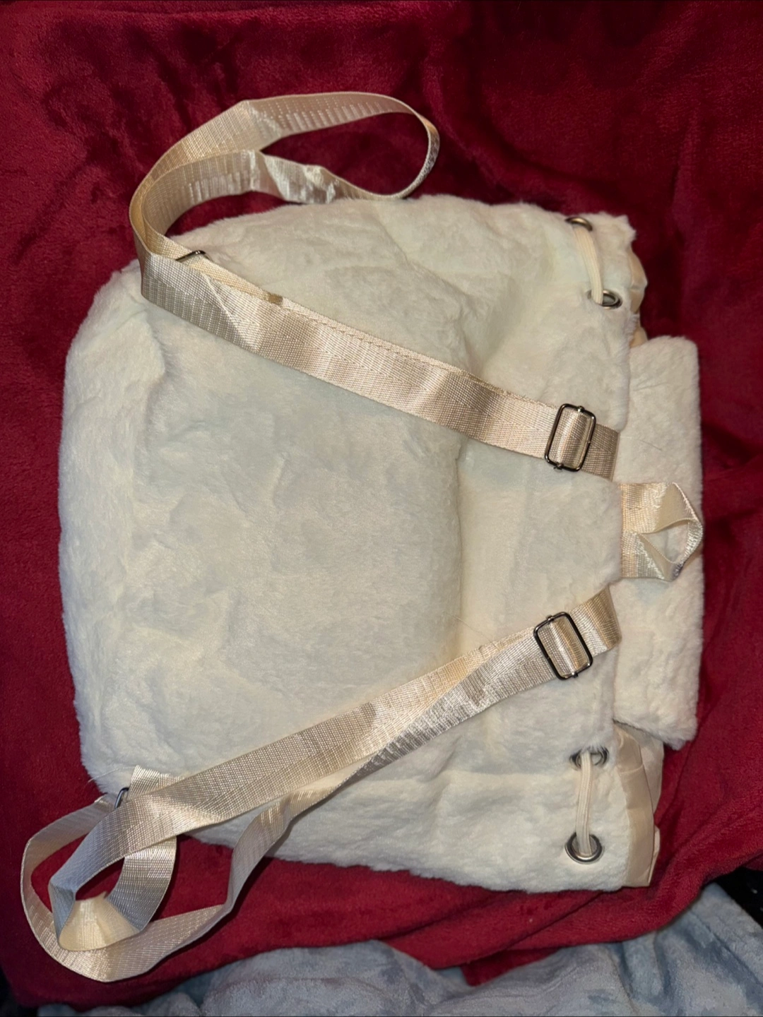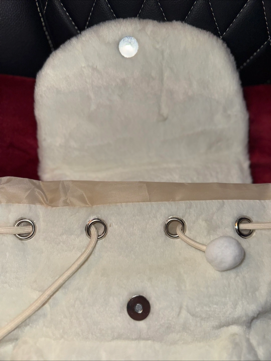 Adorable backpack. White plush material. Features the well known and loved Hello Kitty character. Decently sized it’s able to hold a laptop and books along with a few other items. Drawstring closure with a magnet clasp to hold it shut. Zippered front pocket. Adjustable straps.