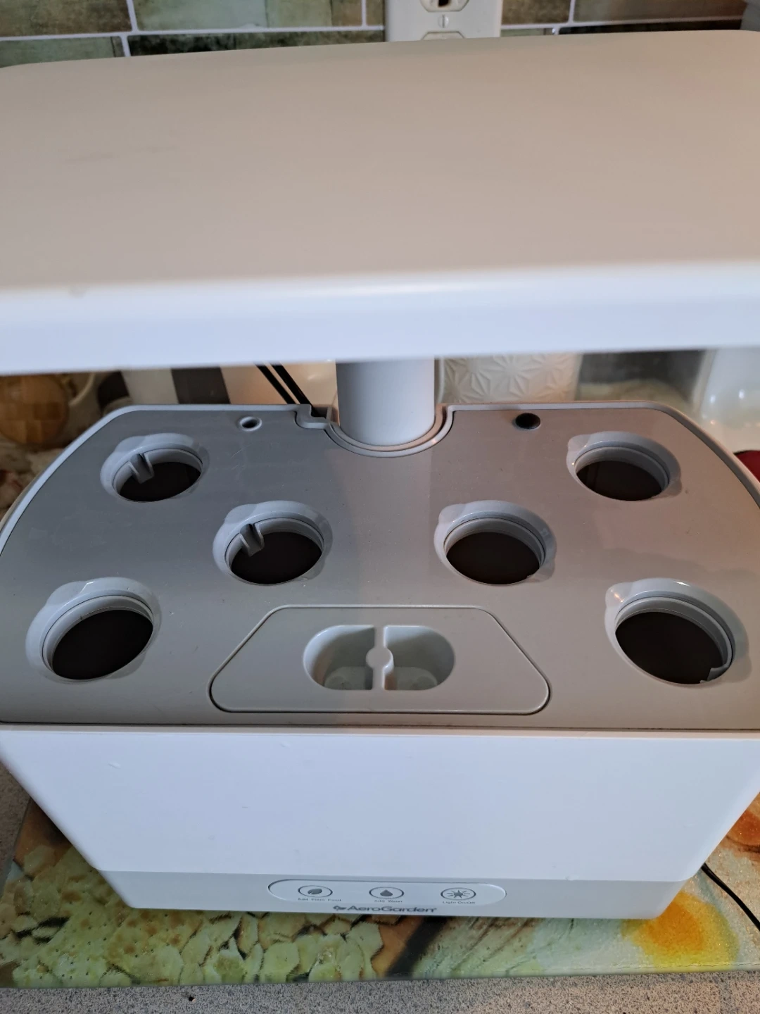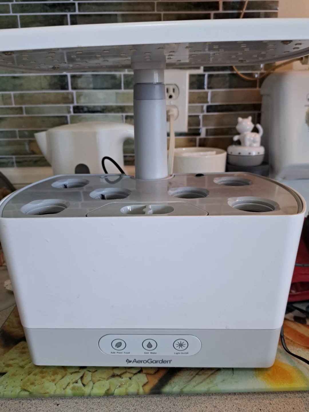 It's an AeroGarden Harvest indoor garden with 6 pod capacity. The unit has built-in LED grow lights and simple touch controls for adding water and plant food. It comes with a power cord.