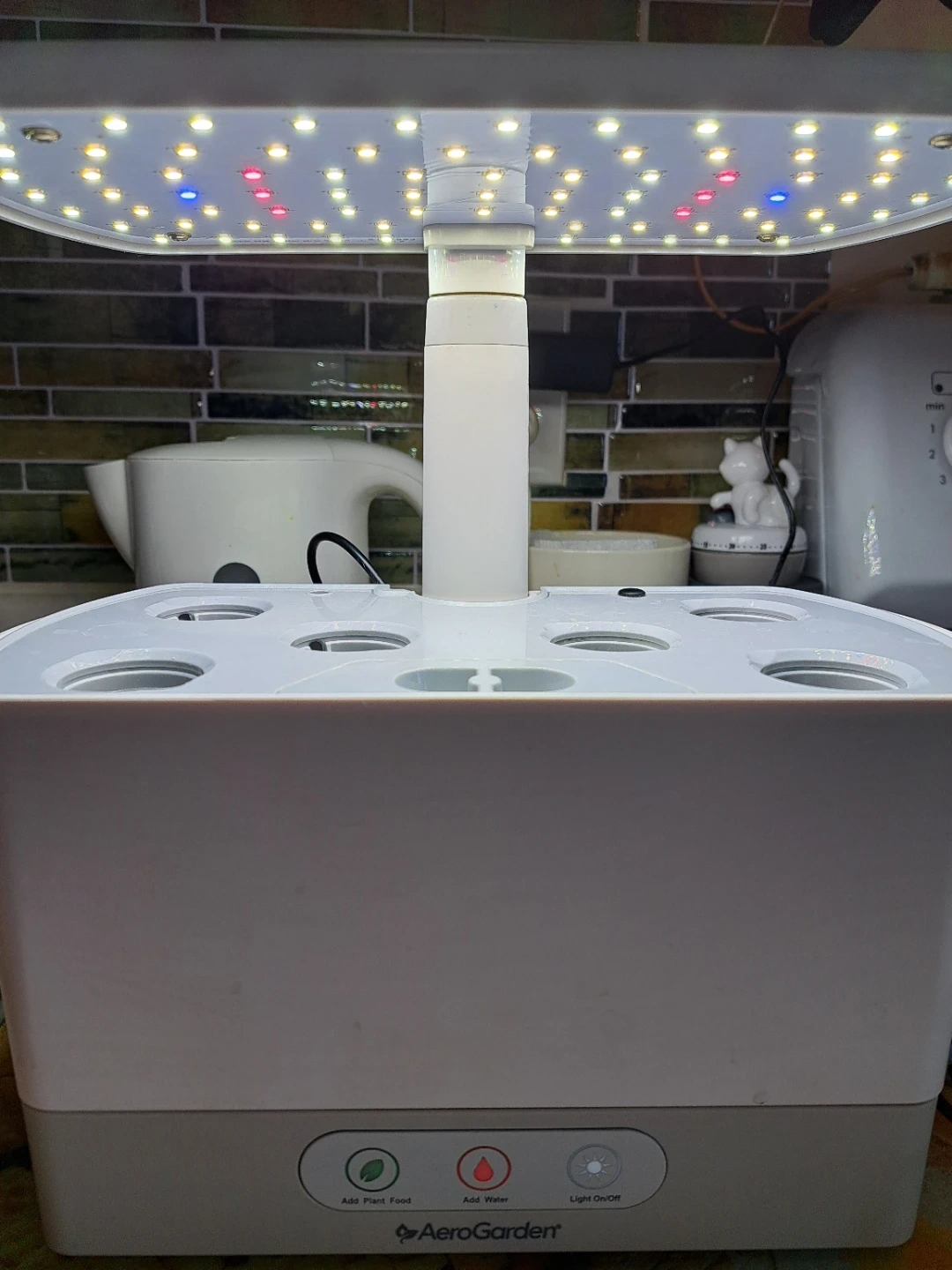 It's an AeroGarden Harvest indoor garden with 6 pod capacity. The unit has built-in LED grow lights and simple touch controls for adding water and plant food. It comes with a power cord.