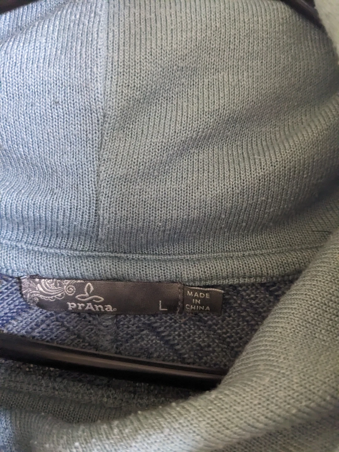 This Prana sweater features a cozy cowl neck and a stylish chevron pattern. It's a size large and lightweight. The drawcord at the hem allows for an adjustable fit.