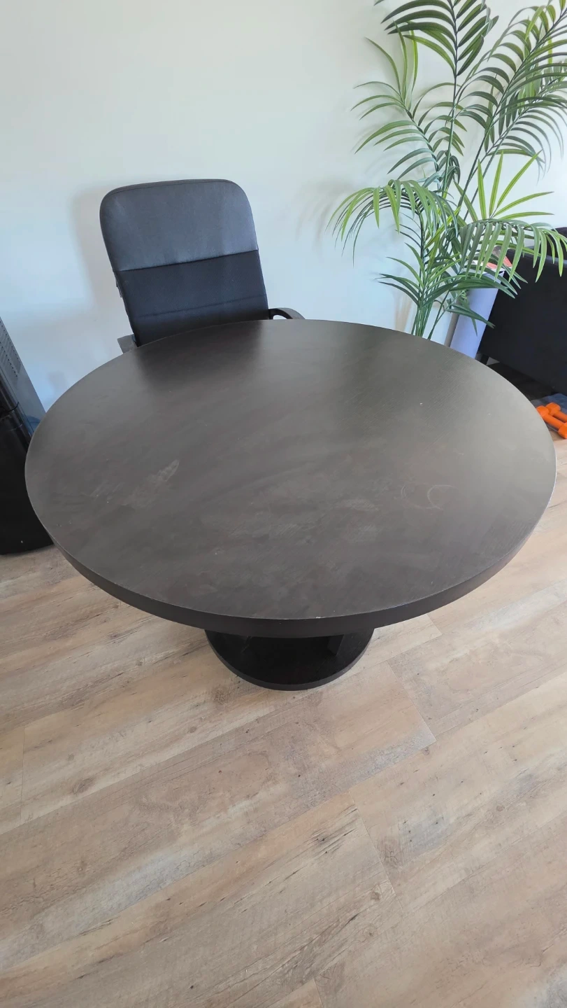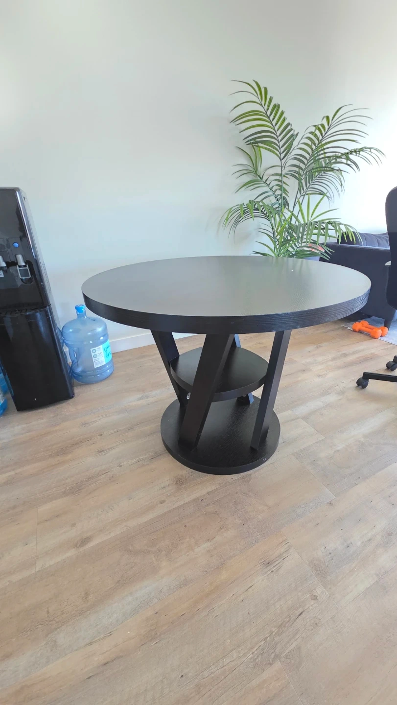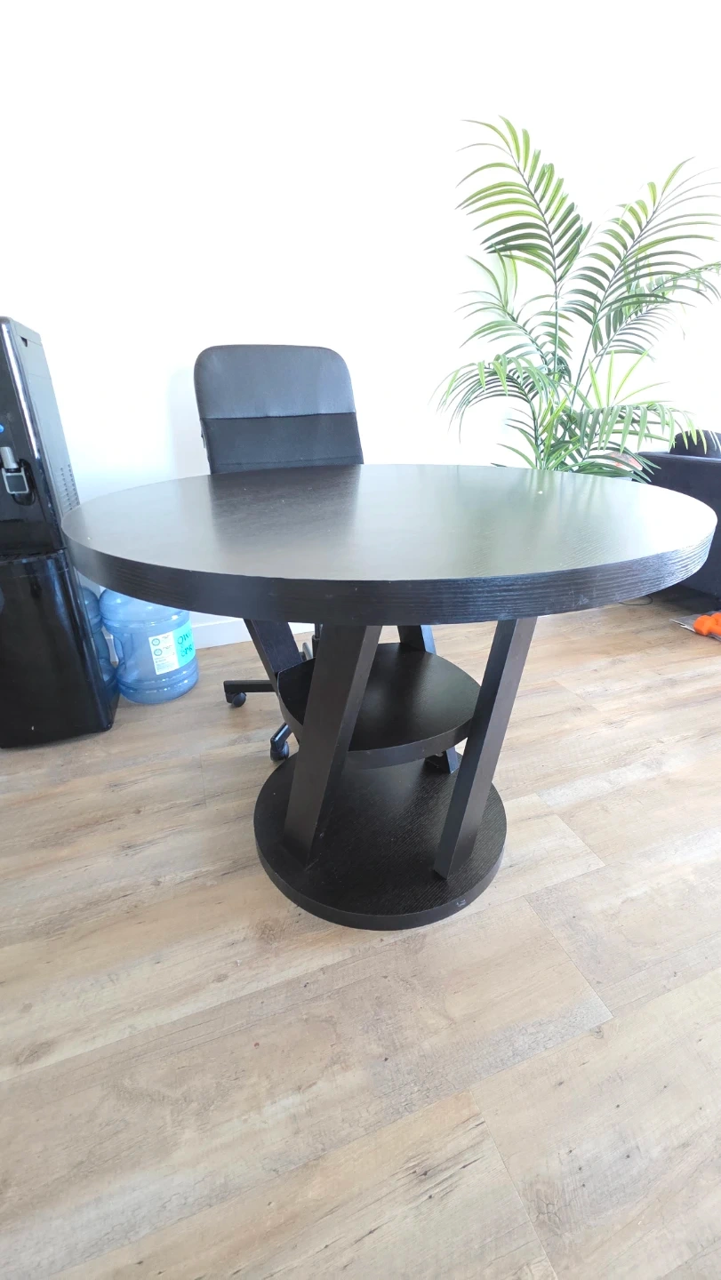 A dark wood round dining table with a unique pedestal base. It's got a modern design that fits well in most spaces. Perfect for a breakfast nook or a smaller dining area. The table is sturdy and ready for a new home!