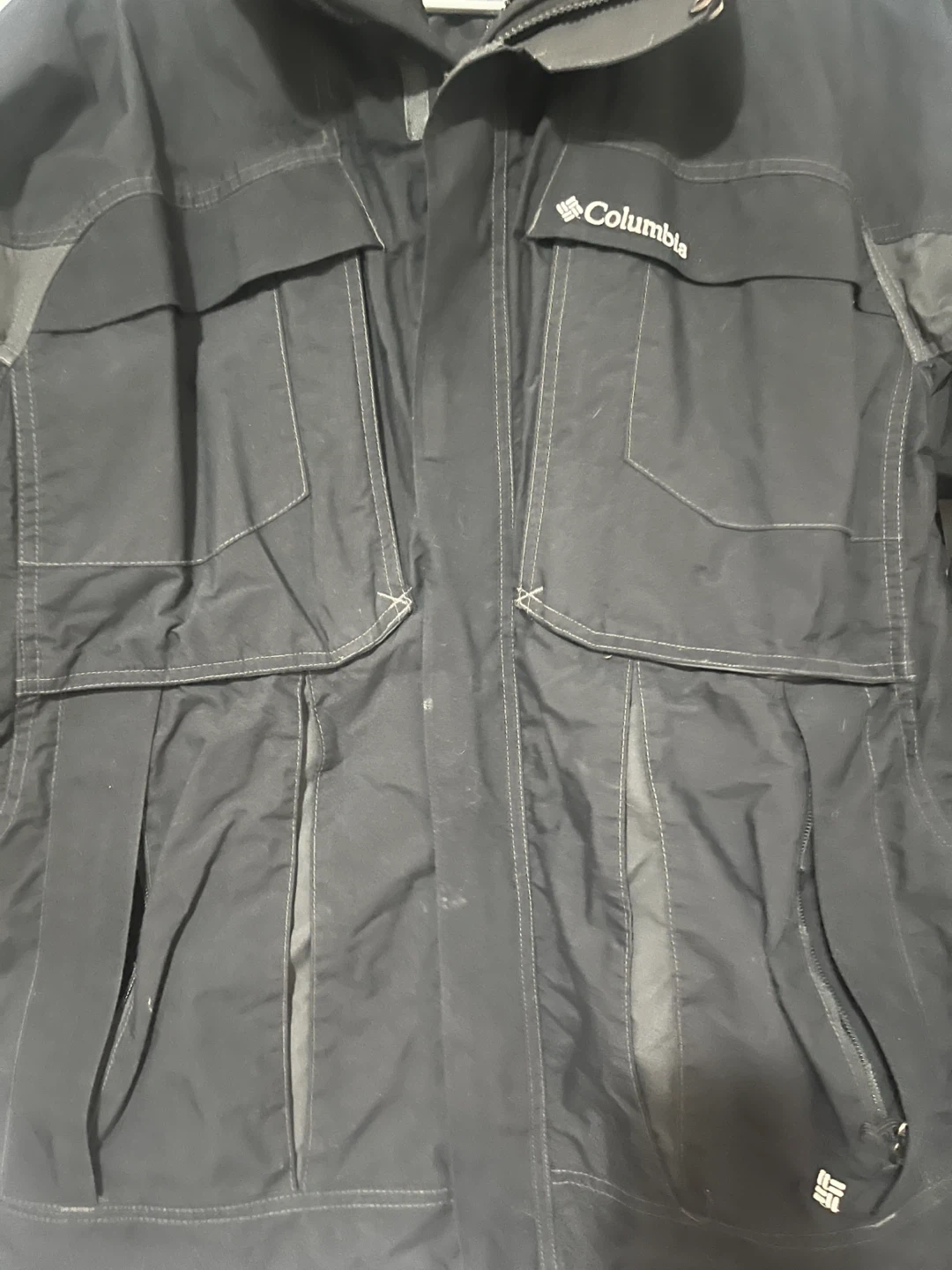 This is a black Columbia jacket with Omni-Heat technology. It's designed for warmth and has multiple pockets for convenience. Great for colder weather!