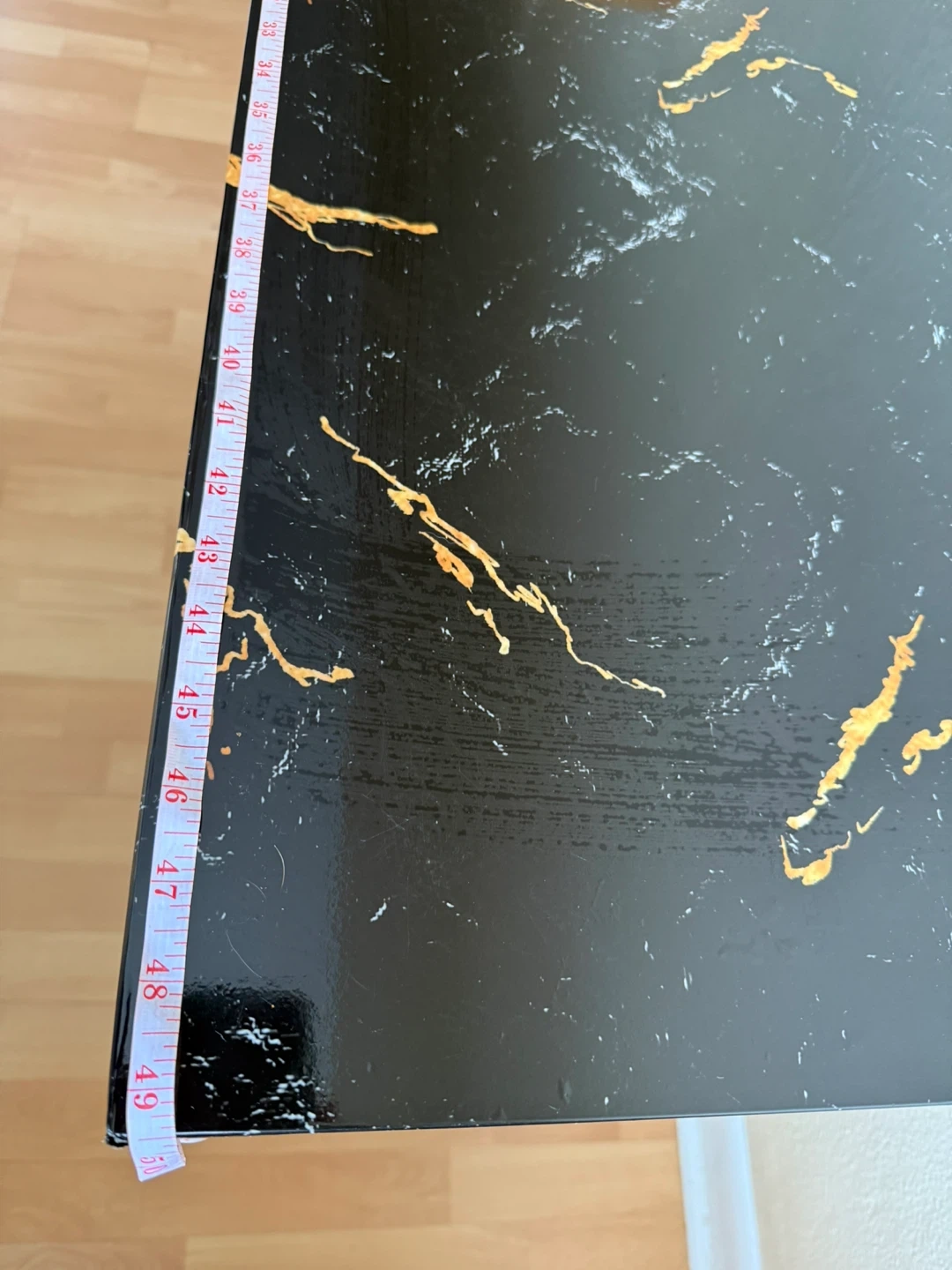A stylish console table with a black marble-look top and a dark wood base. The top measures approximately 49 inches long and 19 inches wide. It's a great accent piece for an entryway or living room!