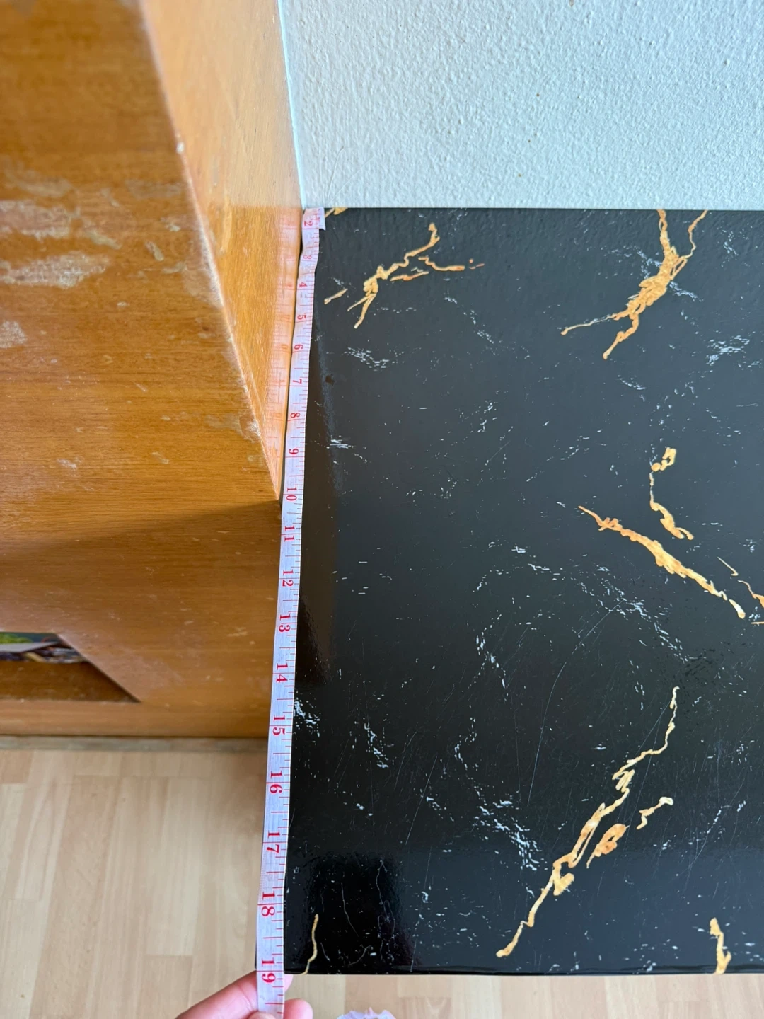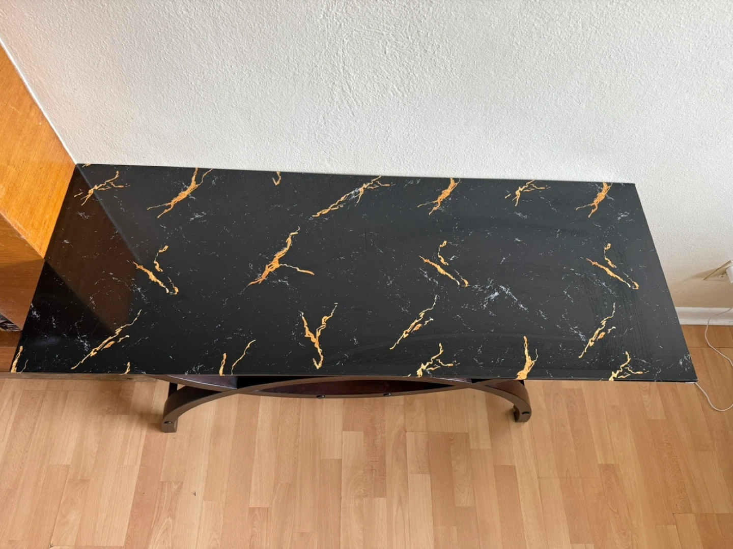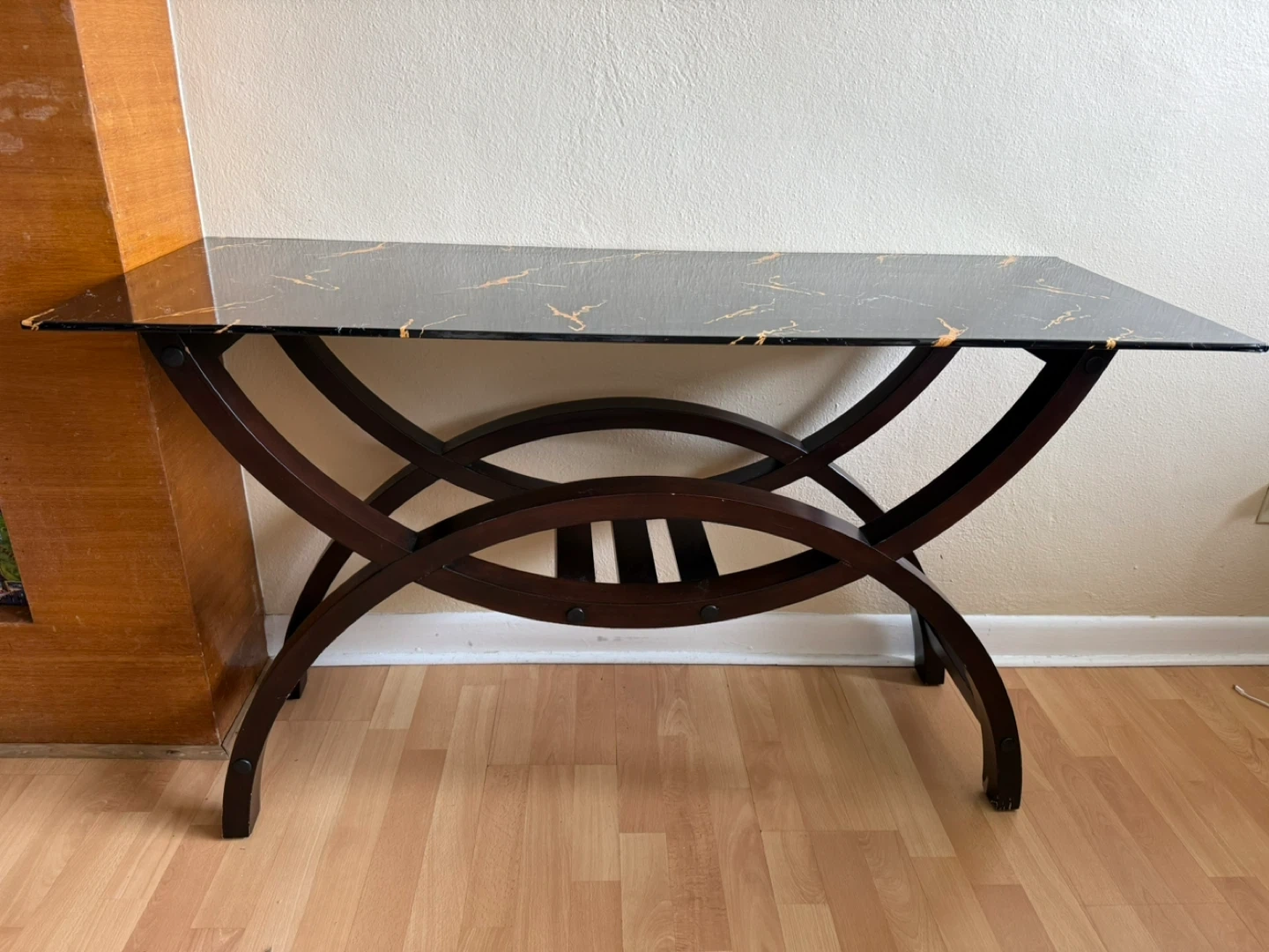 A stylish console table with a black marble-look top and a dark wood base. The top measures approximately 49 inches long and 19 inches wide. It's a great accent piece for an entryway or living room!