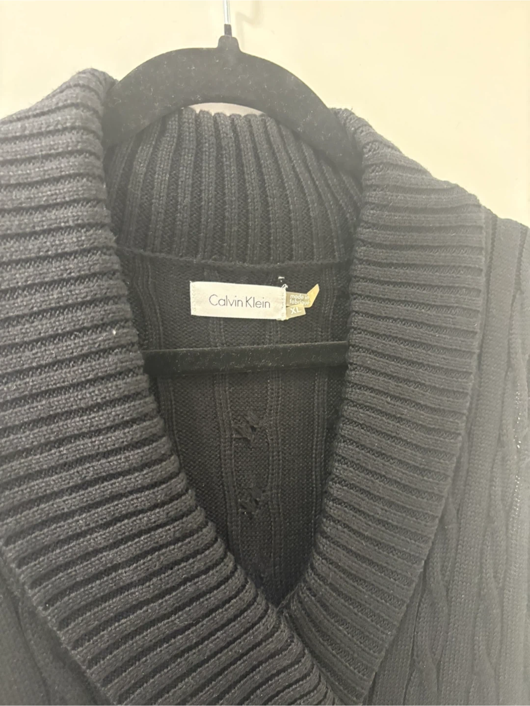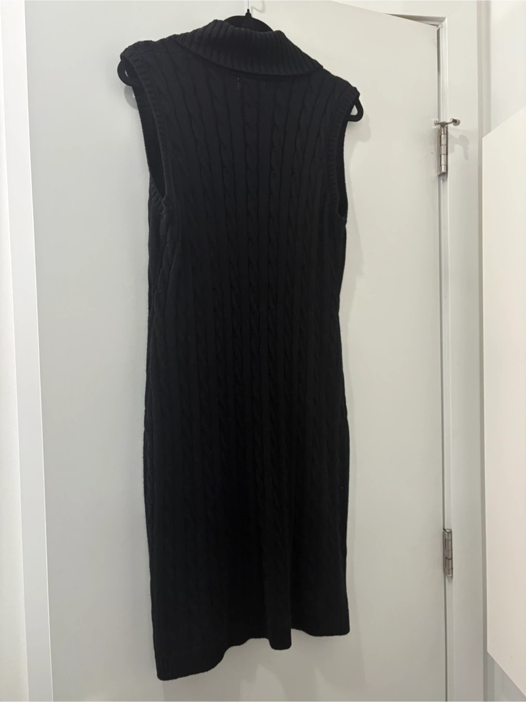 This is a Calvin Klein black sleeveless sweater dress. It features a cable knit pattern and a unique toggle closure at the neckline. The dress has a shawl collar and a knee-length hem. Perfect for layering in cooler weather!