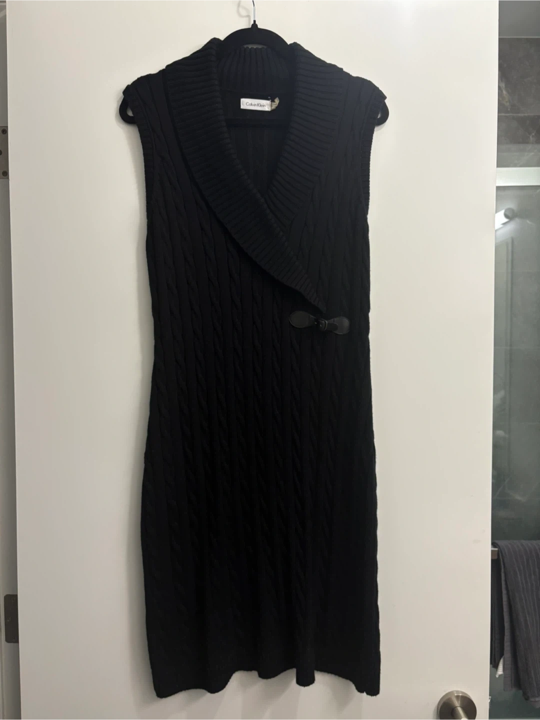 This is a Calvin Klein black sleeveless sweater dress. It features a cable knit pattern and a unique toggle closure at the neckline. The dress has a shawl collar and a knee-length hem. Perfect for layering in cooler weather!