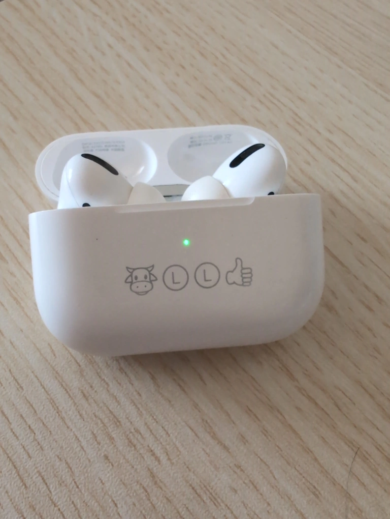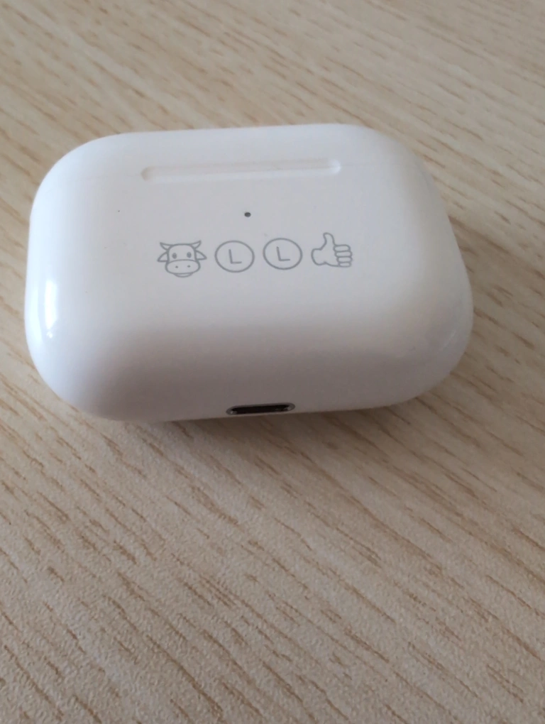 White wireless earbuds with Charging case. Sometimes the charging may not fully charge if you use non Apple chargers. Good for meetings, calls in noisy environment with Active noise cancellation.