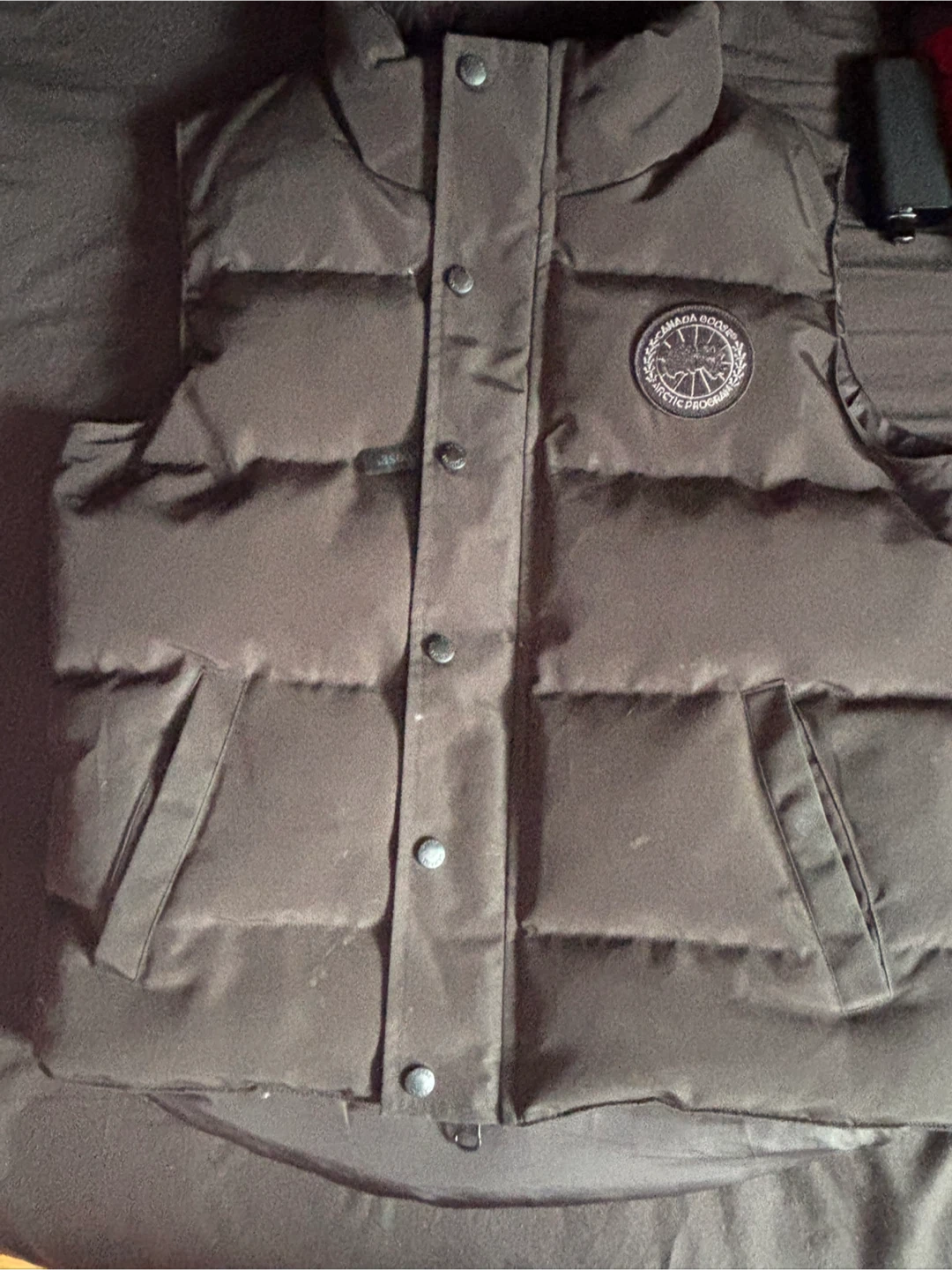 Puffer vest by Canada Goose. It's a dark brown colour with a snap-button closure. Great for layering on cooler days!