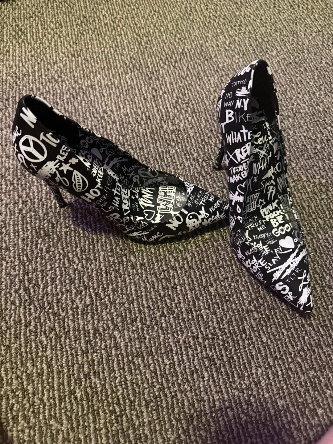 These stylish pumps feature a bold black and white graffiti print pointed toe with a stiletto heel. These shoes are perfect for adding a statement to any outfit!