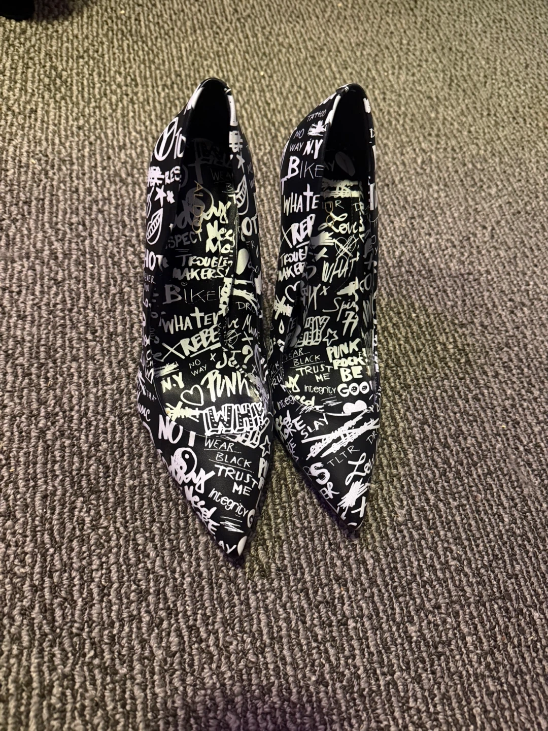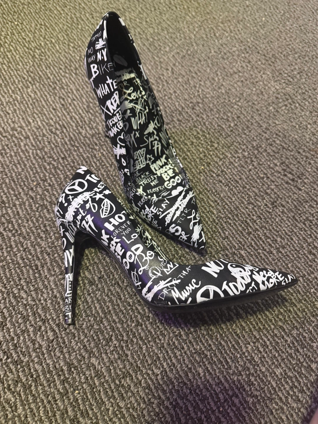 These stylish pumps feature a bold black and white graffiti print pointed toe with a stiletto heel. These shoes are perfect for adding a statement to any outfit!