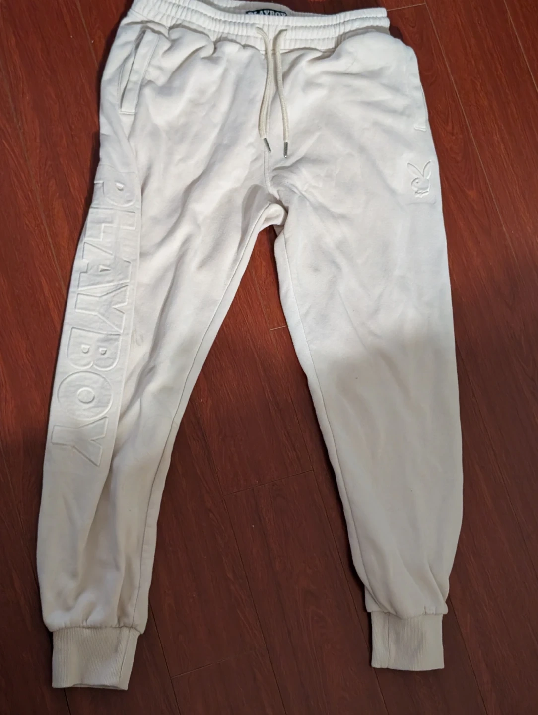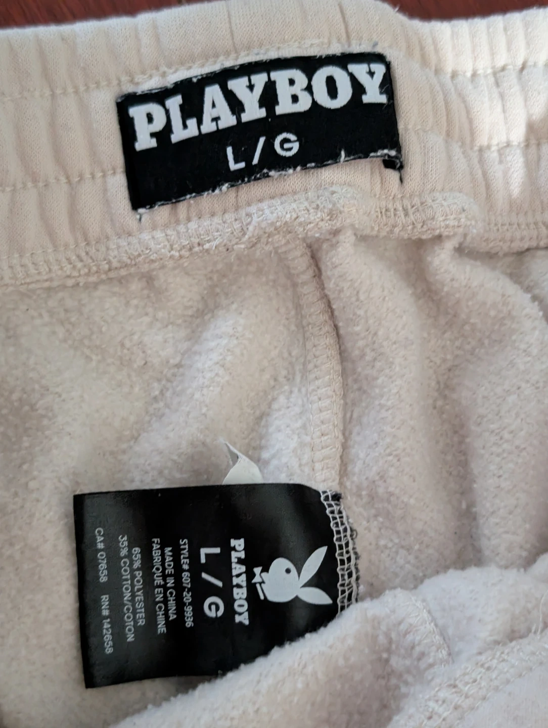 Cream coloured Playboy joggers. Features an embroidered Playboy bunny logo on the left leg and "PLAYBOY" text down the right leg. Made from a 65% polyester and 35% cotton blend. Size large.