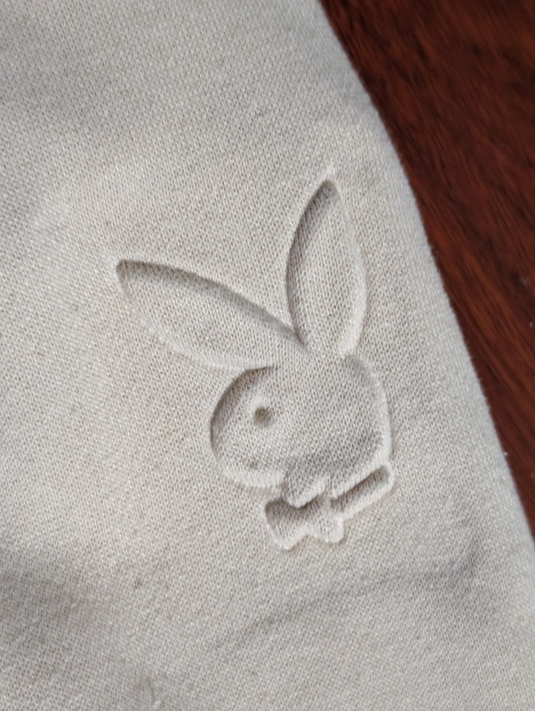 Cream coloured Playboy joggers. Features an embroidered Playboy bunny logo on the left leg and "PLAYBOY" text down the right leg. Made from a 65% polyester and 35% cotton blend. Size large.