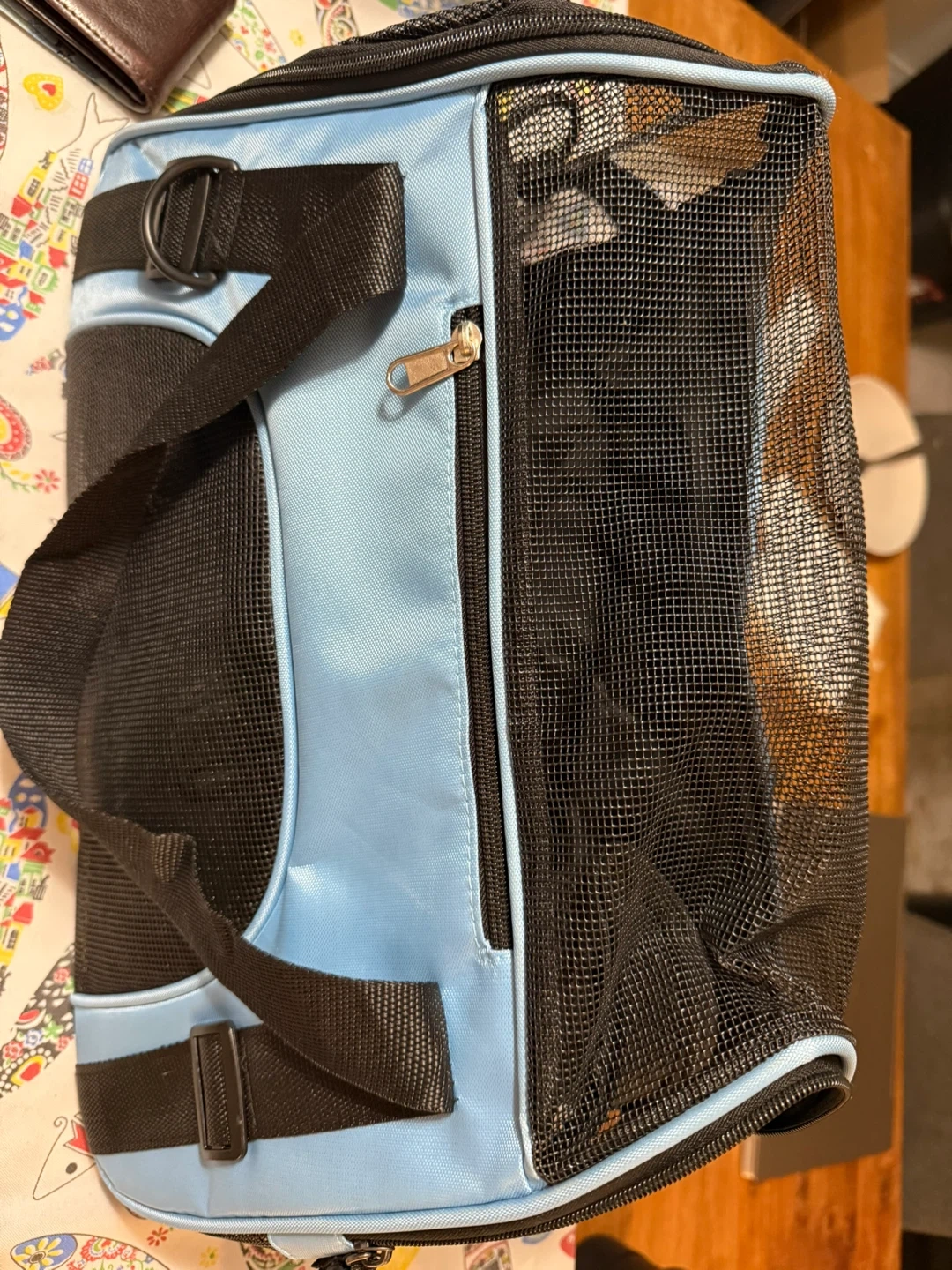 This is a light blue pet carrier bag with mesh ventilation on the sides. It has a zippered front pocket and adjustable shoulder straps. It's great for taking small pets on the go!