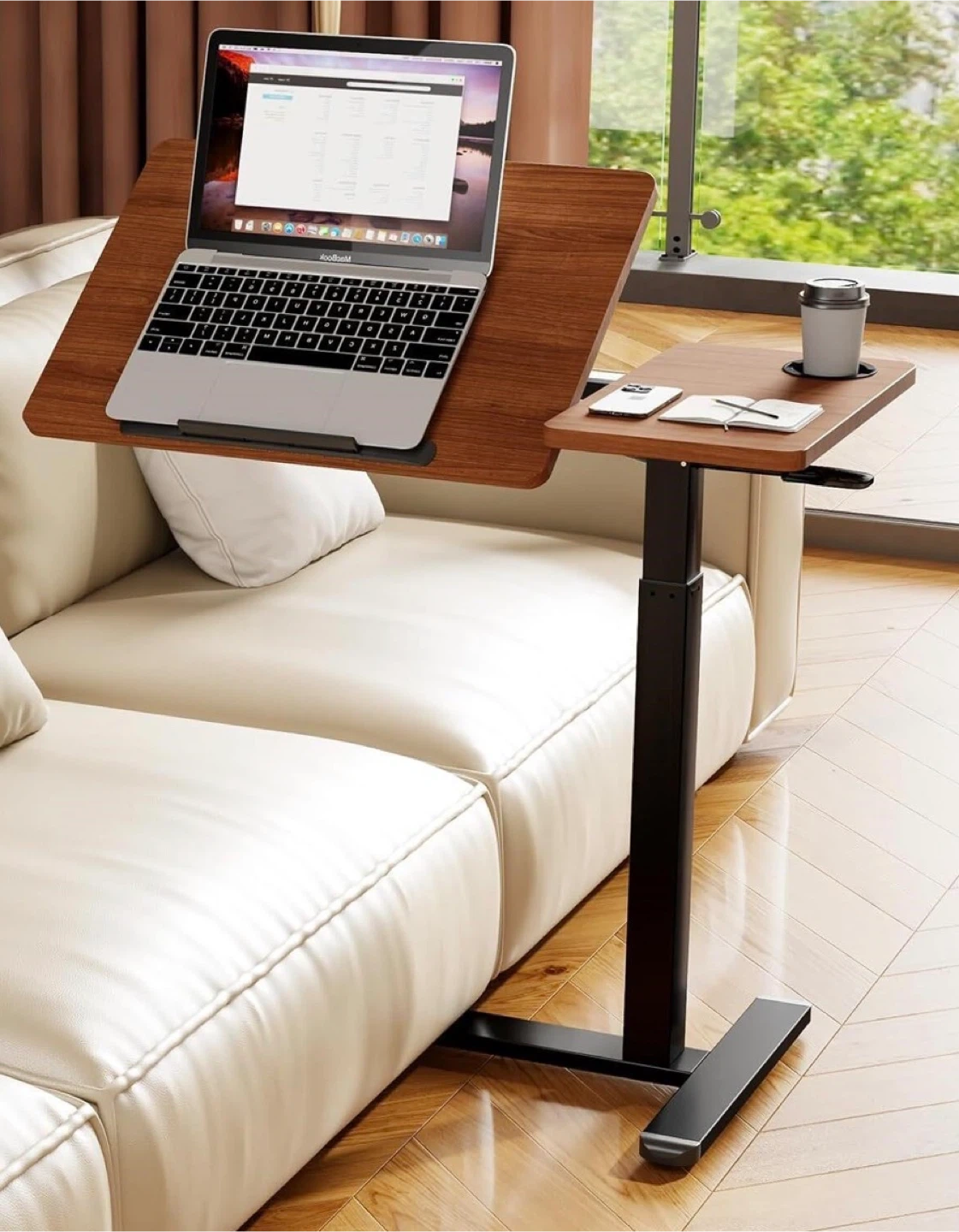 Pneumatic height adjustable overbed table. Features a cup holder and a smooth wood-grain surface. The height ranges from 28.74 to 43.5 inches. Useful for working or eating comfortably from a chair or sofa.