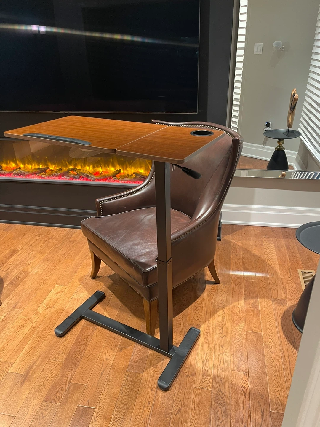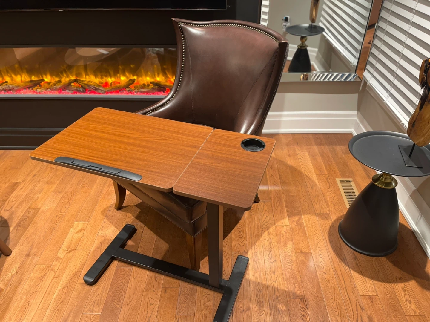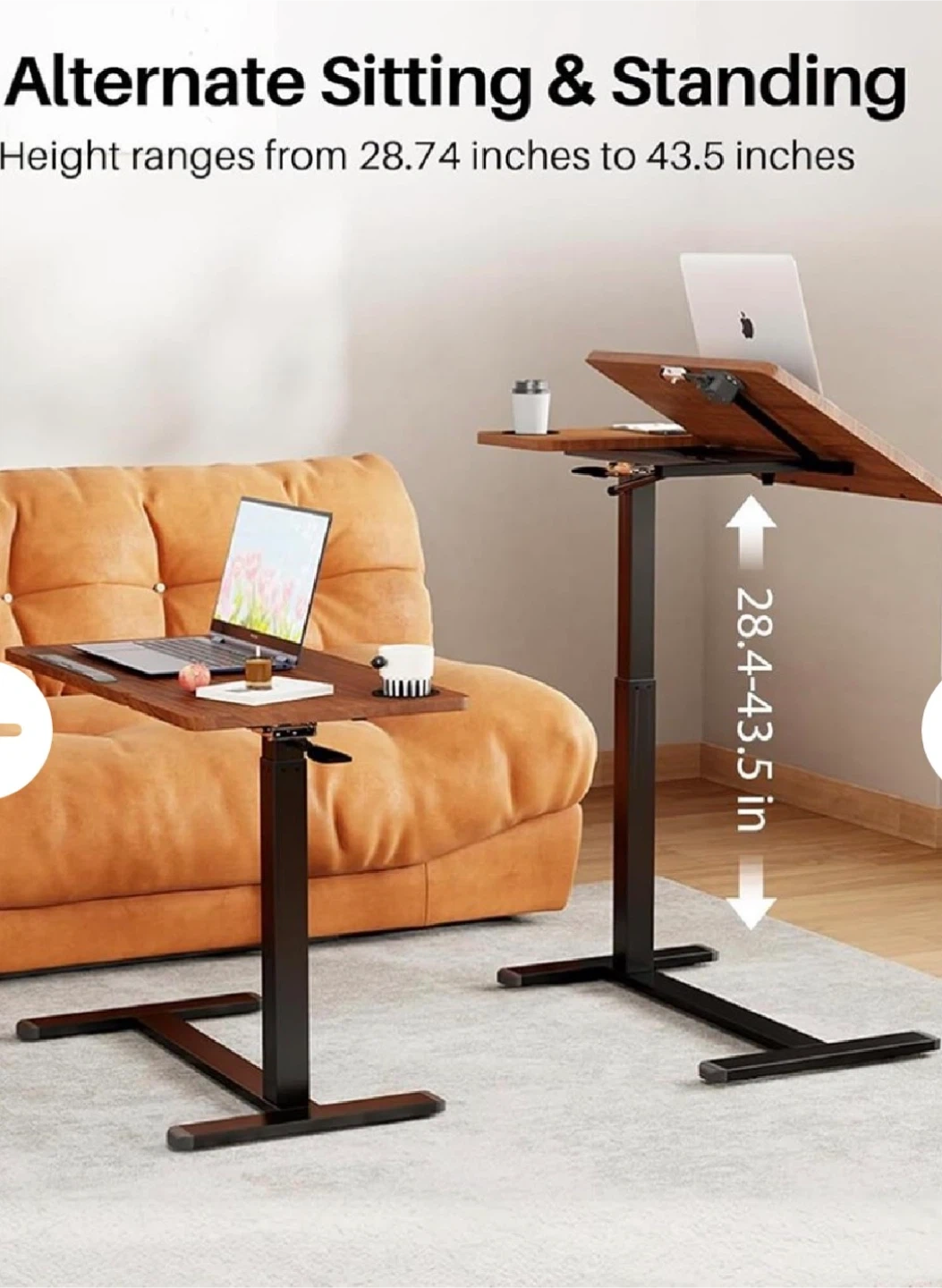 Pneumatic height adjustable overbed table. Features a cup holder and a smooth wood-grain surface. The height ranges from 28.74 to 43.5 inches. Useful for working or eating comfortably from a chair or sofa.