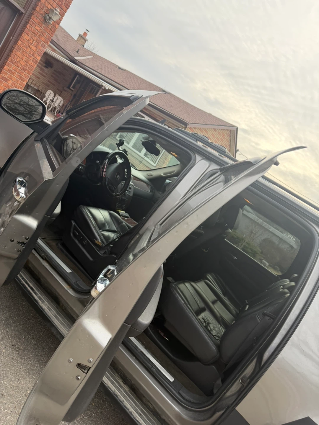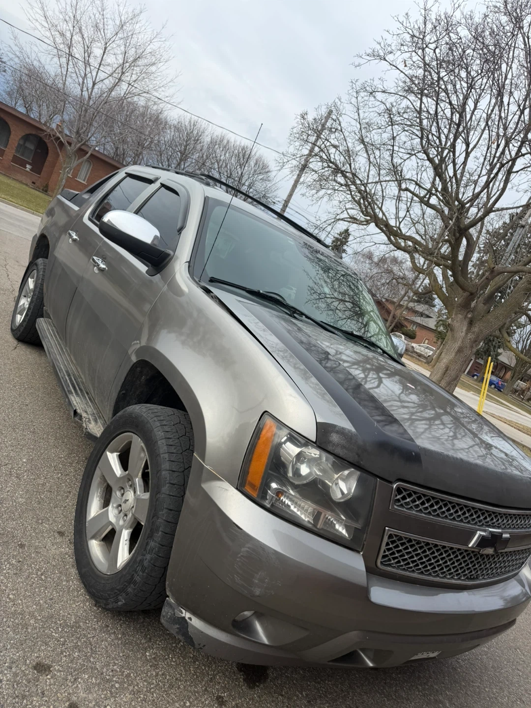This is a grey Chevrolet Avalanche. It has a dark interior with wood trim accents. The exterior is grey and shows some signs of wear. Engine and transmission is good