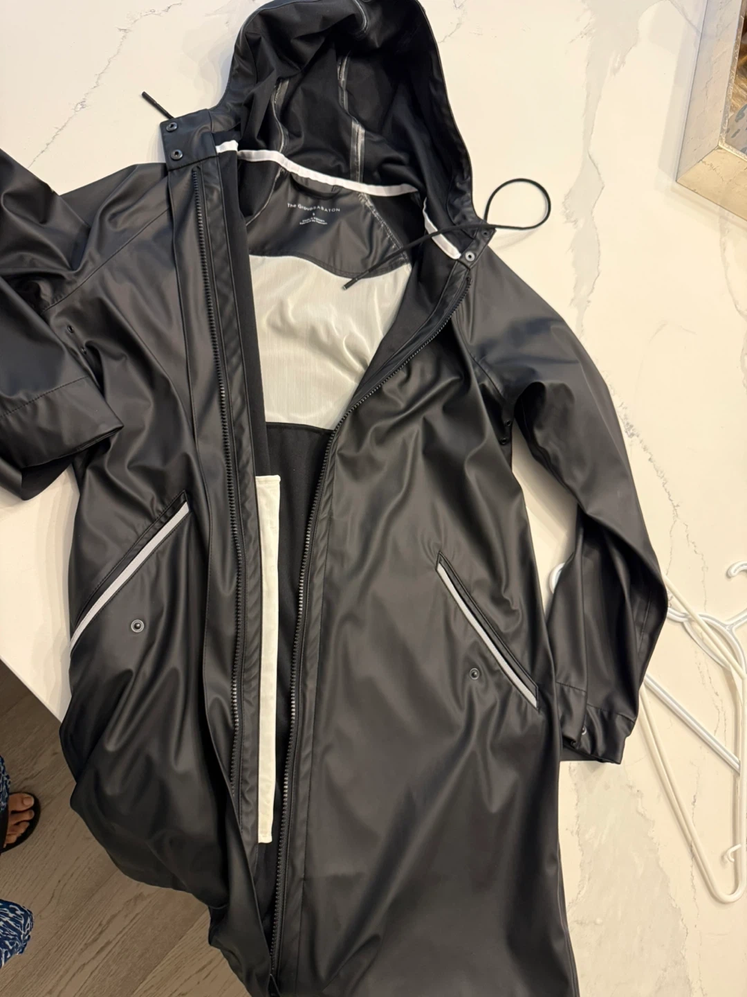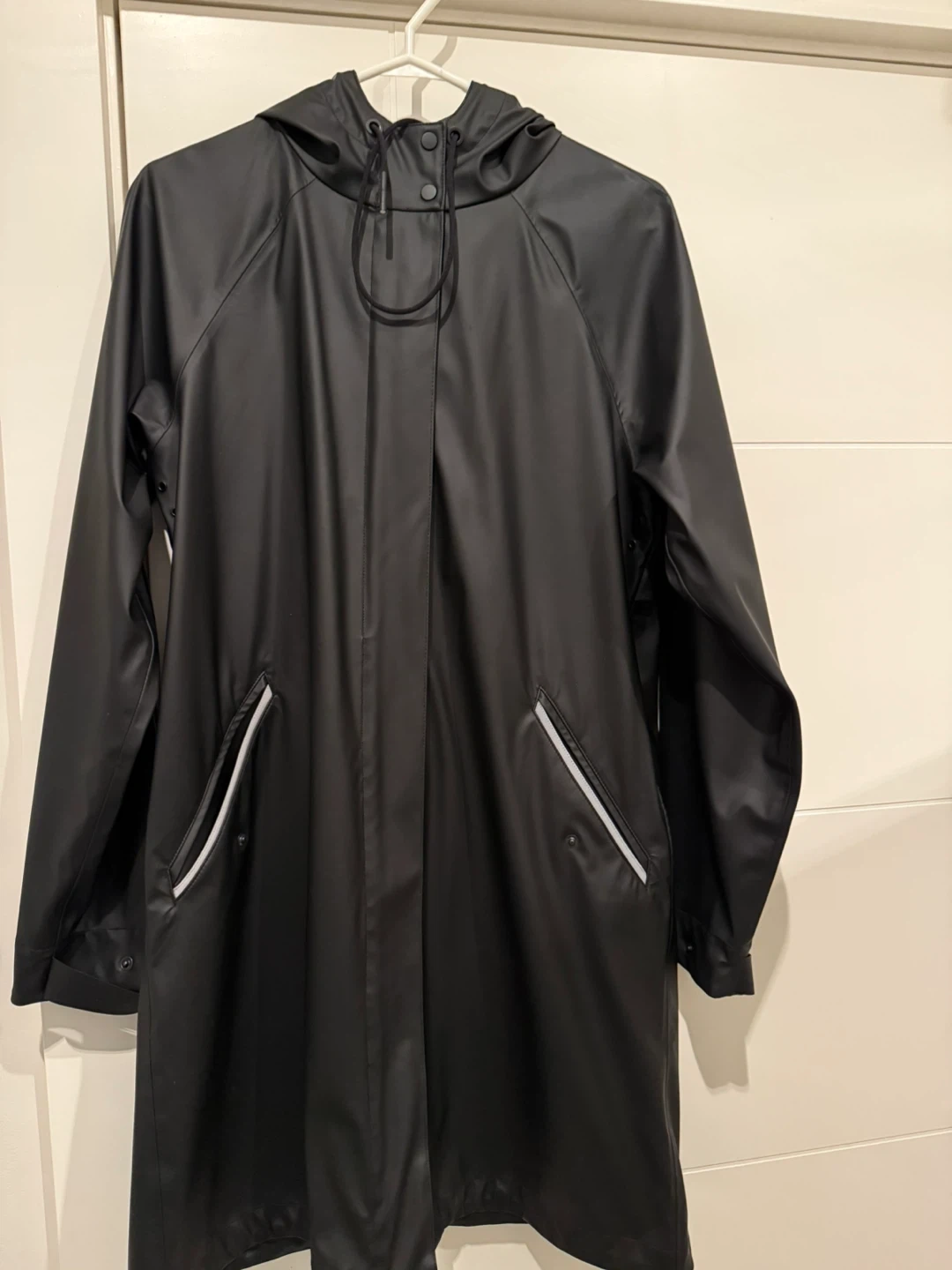 Selling a black raincoat from The Group A Baton. It's a size small and has a hood. Perfect for rainy days!