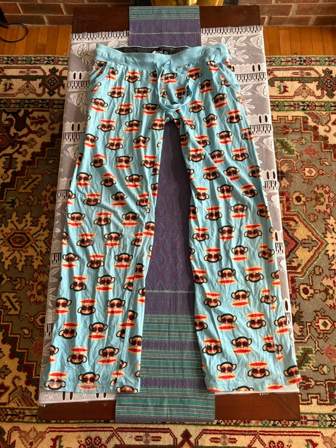 Light blue pajama pants with a repeating monkey print. These are a size XL and feature a drawstring waist. Made from a soft, comfortable material for lounging. In good used condition.