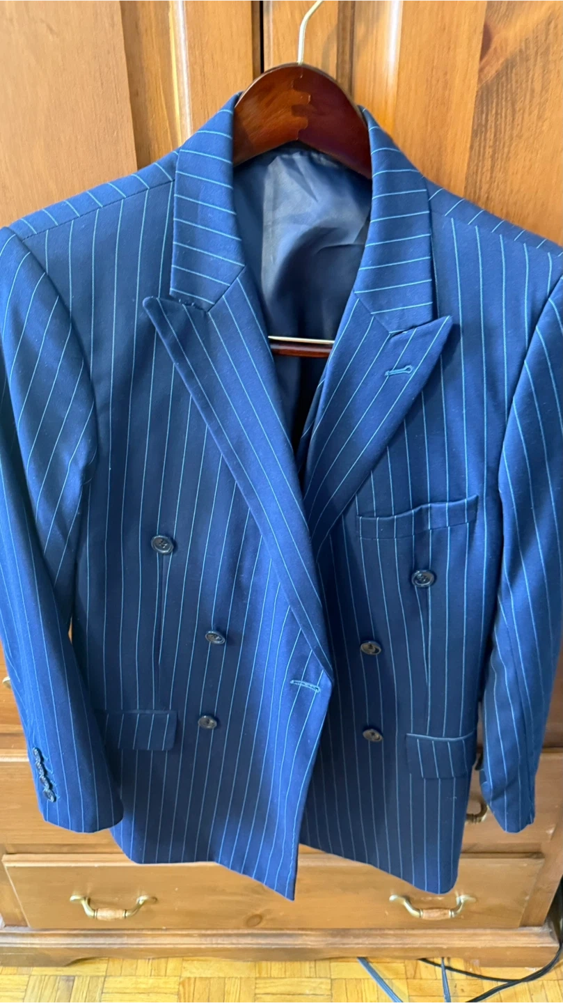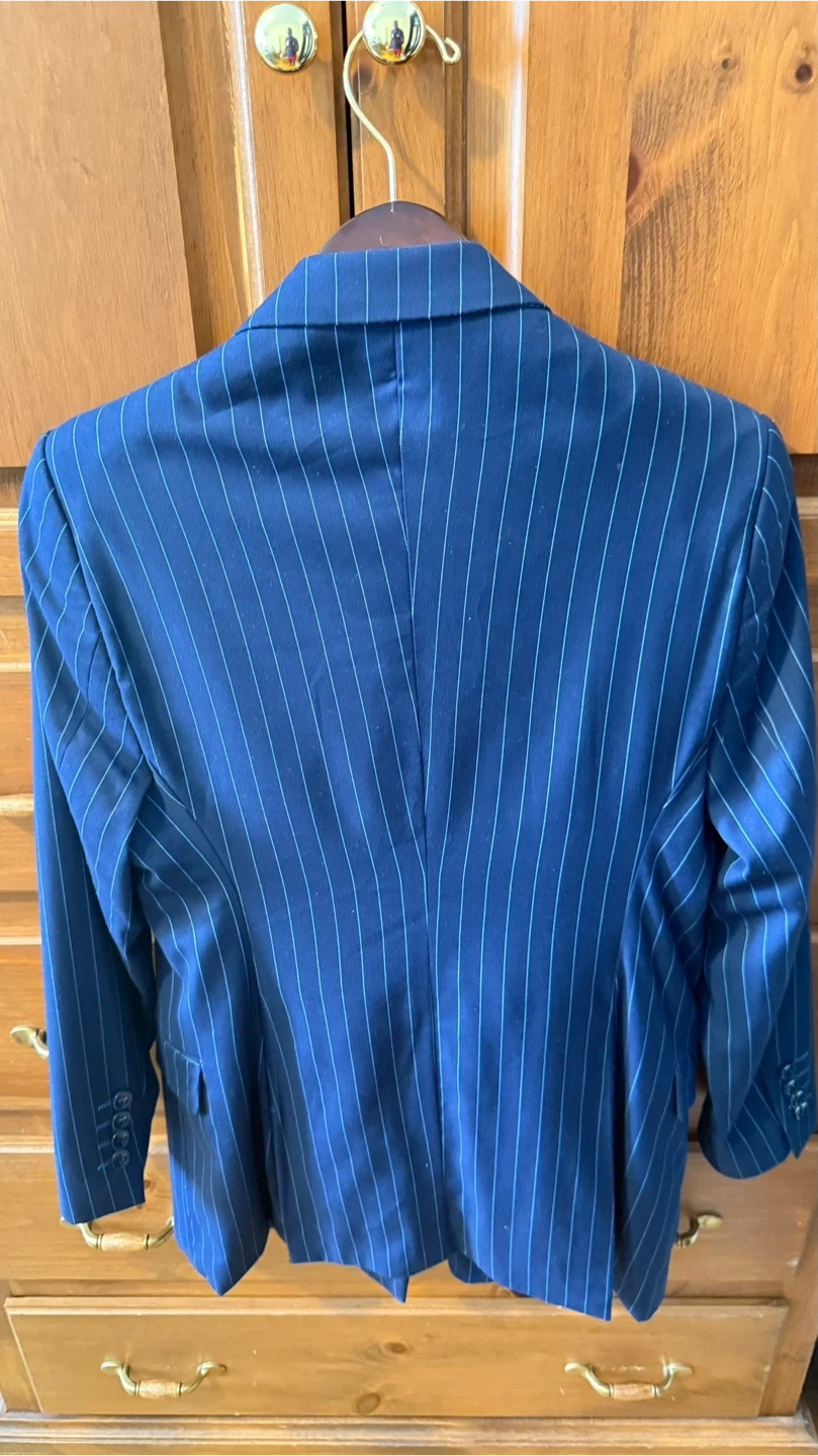 A sharp navy blue blazer featuring a classic pinstripe pattern. It's a double-breasted style with button detailing on the front and cuffs. This jacket is perfect for adding a touch of sophistication to any outfit.