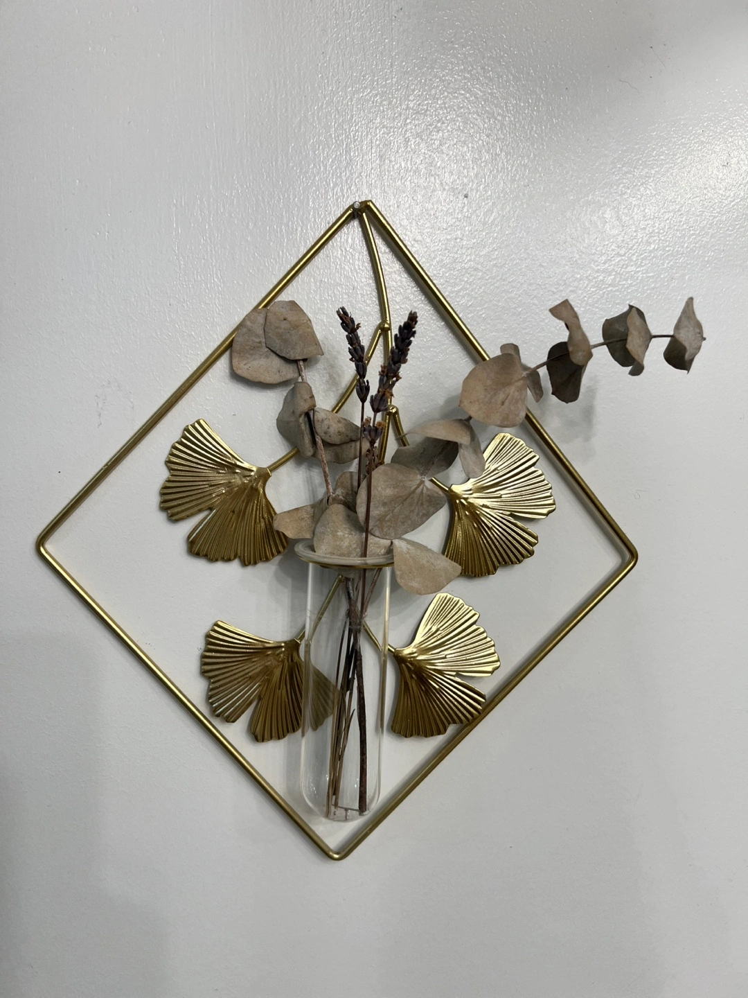 A striking wall mounted vase. Features a geometric design with a gold-coloured frame. Includes a glass vase in the center. A wonderful addition to any home for some natural decor.