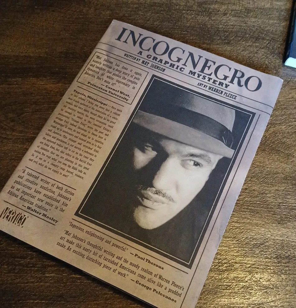 This is Incognegro, a graphic mystery written by Mat Johnson and art by Warren Pleece. It's a story that probes the complex dynamics of white supremacy in America. The graphic novel features writing by Mat Johnson and art by Warren Pleece.