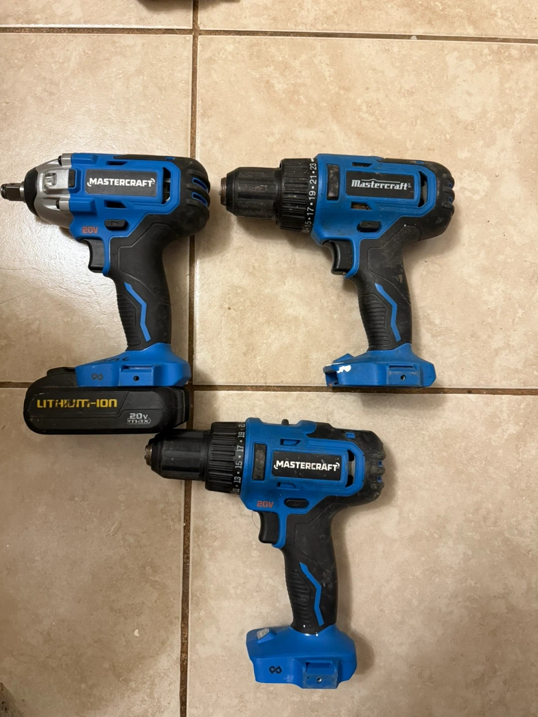 Set includes one Mastercraft 20V cordless impact wrench and two 20V cordless drills. All tools are blue and black. Lithium-ion batteries are included.