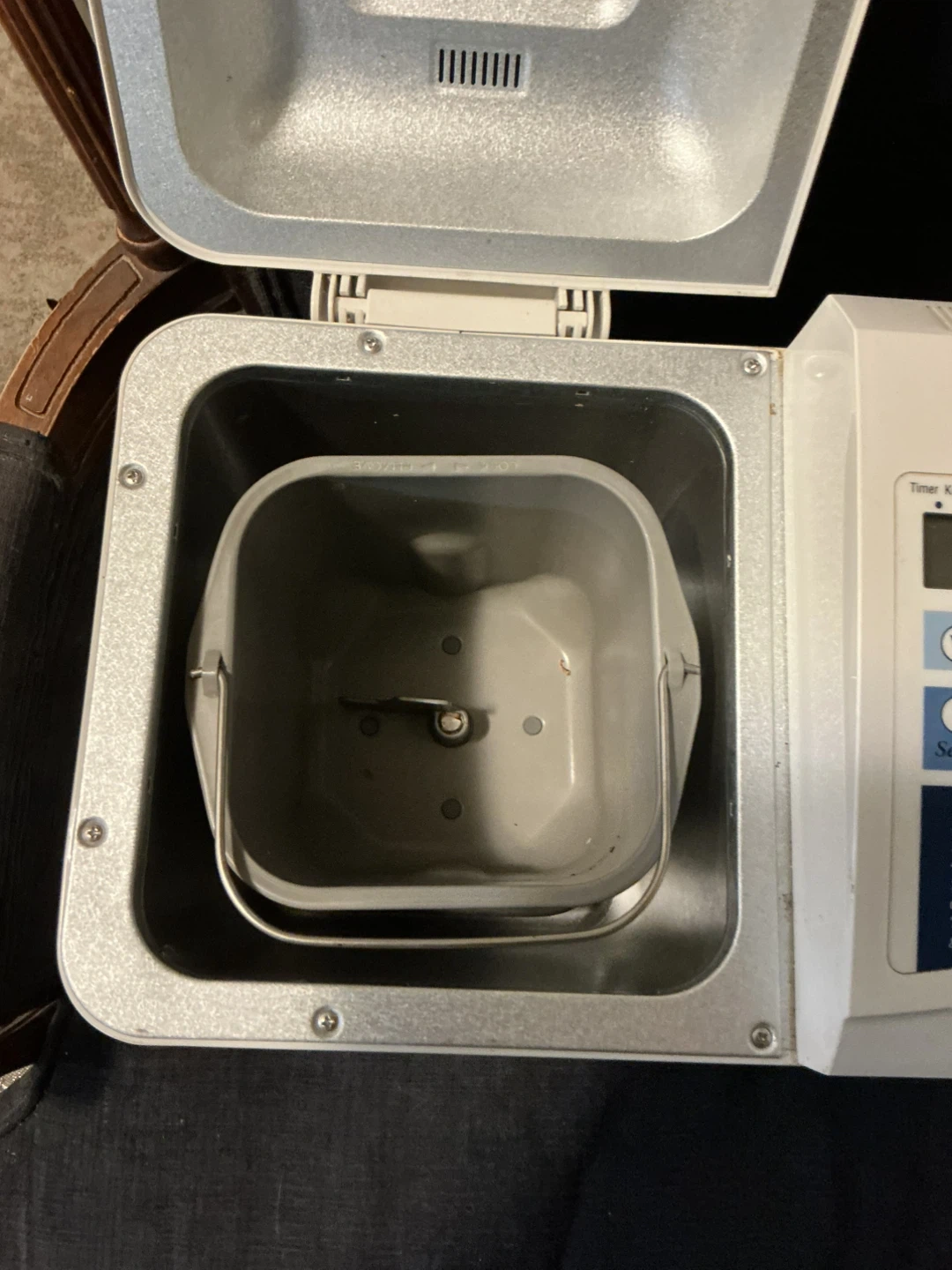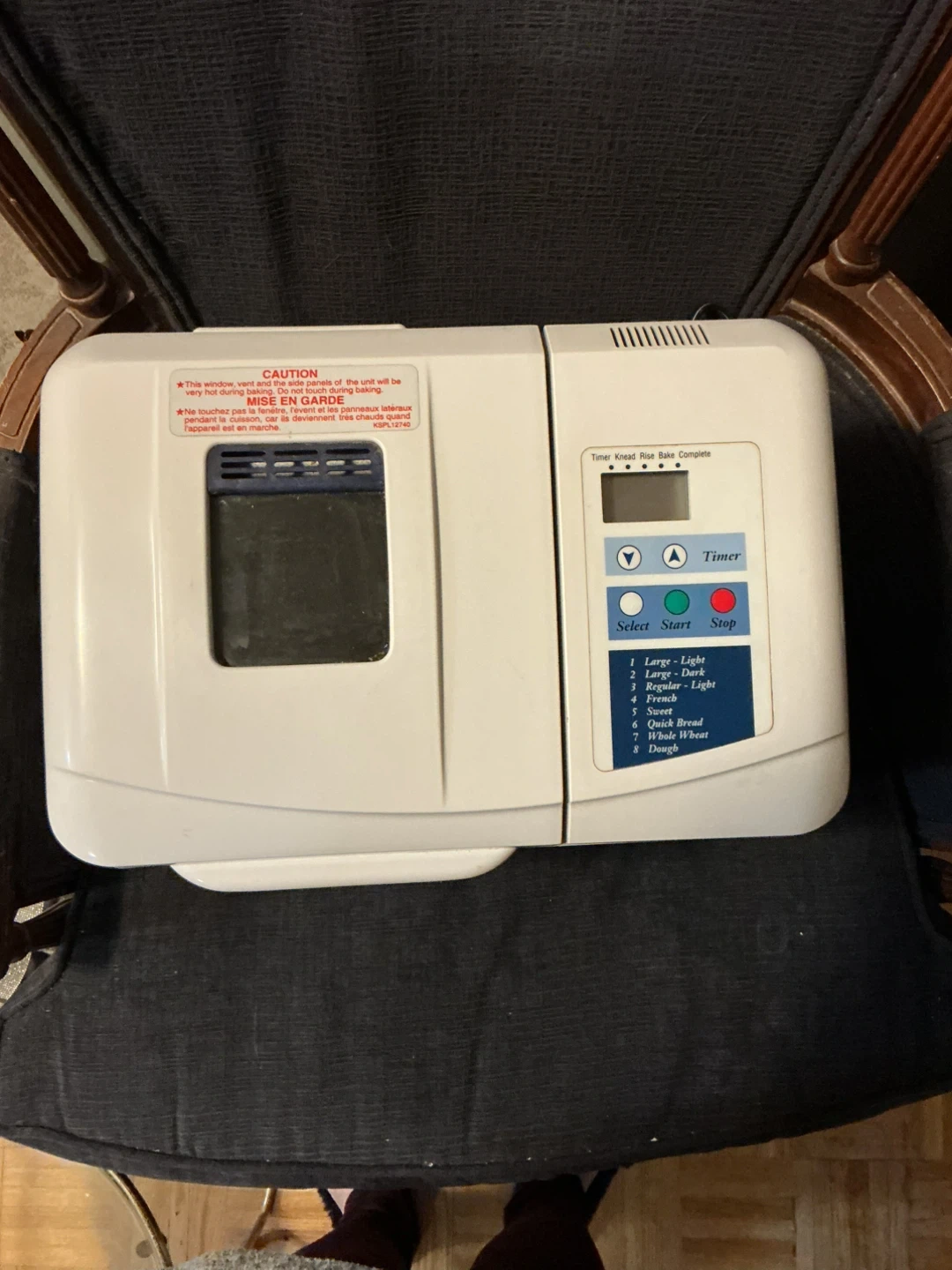 Selling a Kitchen Pro bread maker. It has settings for different types of bread, including large-light, large-dark, regular-light, French, sweet, quick bread, whole wheat, and dough. It also has a timer, knead, rise, bake, and complete indicator