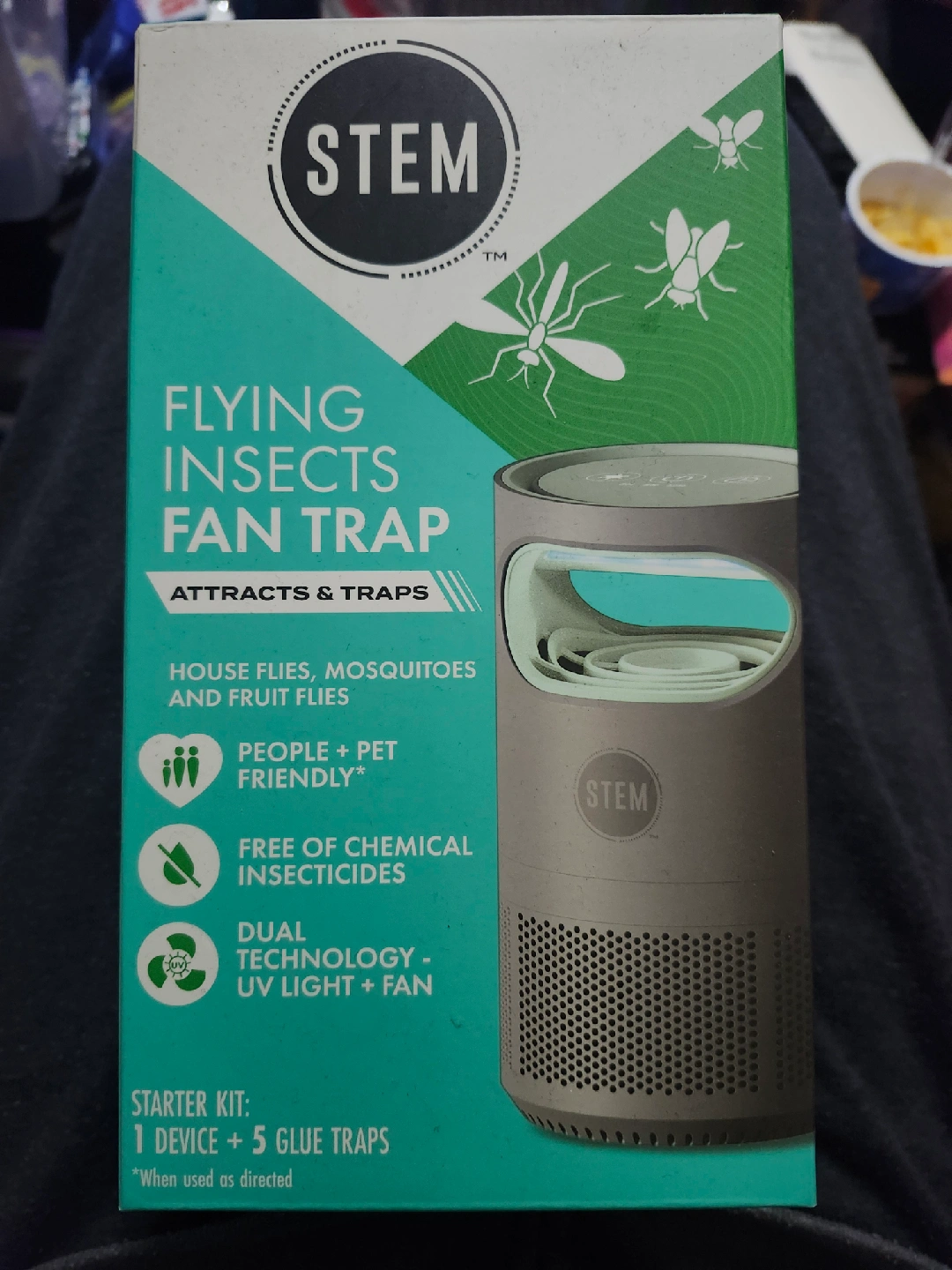 I'm selling a new STEM Flying Insects Fan Trap starter kit! It attracts and traps house flies, mosquitoes, and fruit flies. It's people and pet friendly, and free of chemical insecticides. This starter kit includes one device and five glue traps, using dual technology with UV light and a fan
