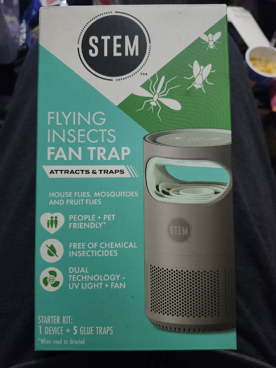 I'm selling a new STEM Flying Insects Fan Trap starter kit! It attracts and traps house flies, mosquitoes, and fruit flies. It's people and pet friendly, and free of chemical insecticides. This starter kit includes one device and five glue traps, using dual technology with UV light and a fan