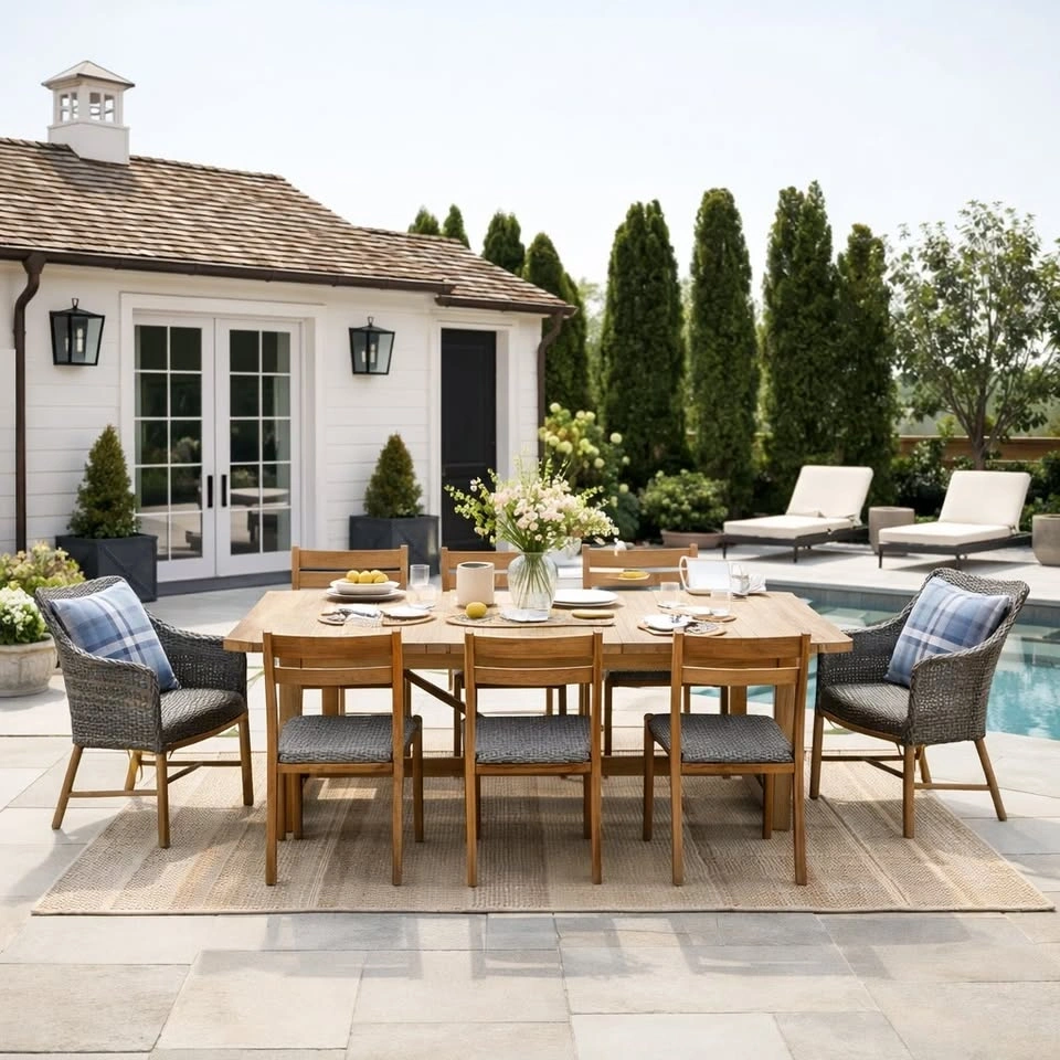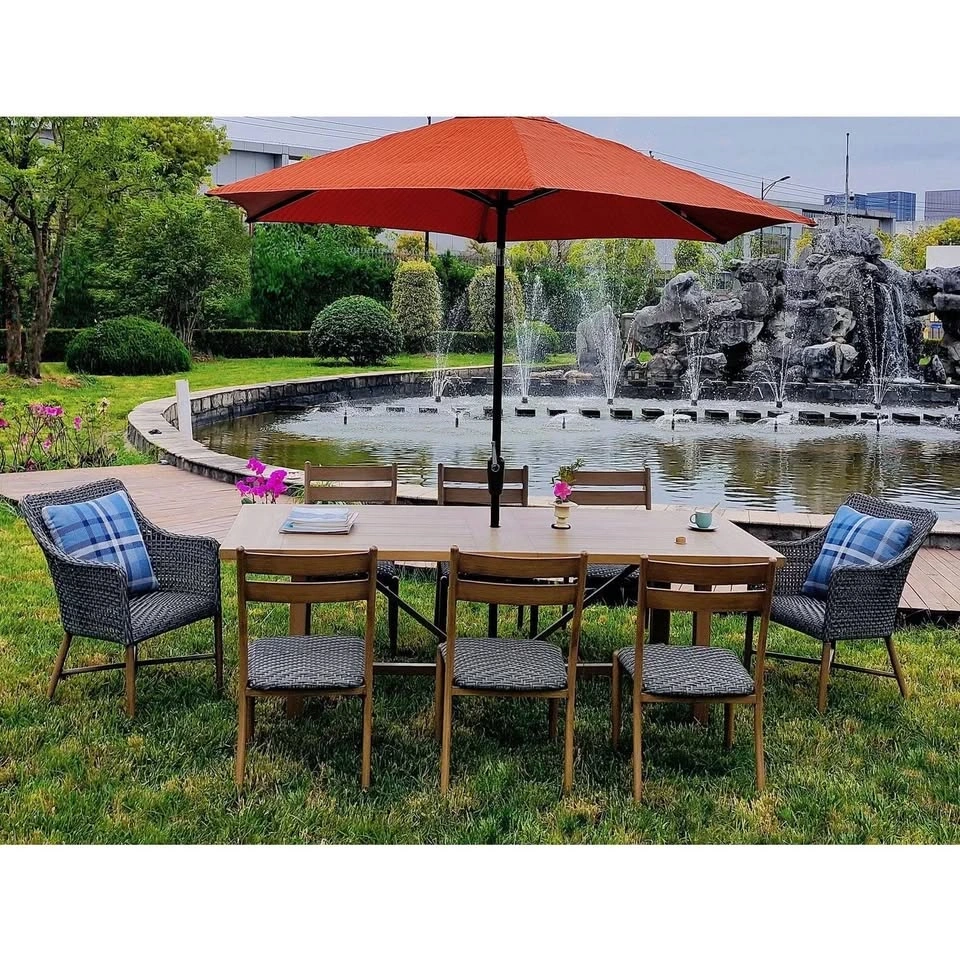 Weather resistant and UV resistant 9-piece patio dining set with seating for 8, and a built-in umbrella hole for optional shade.