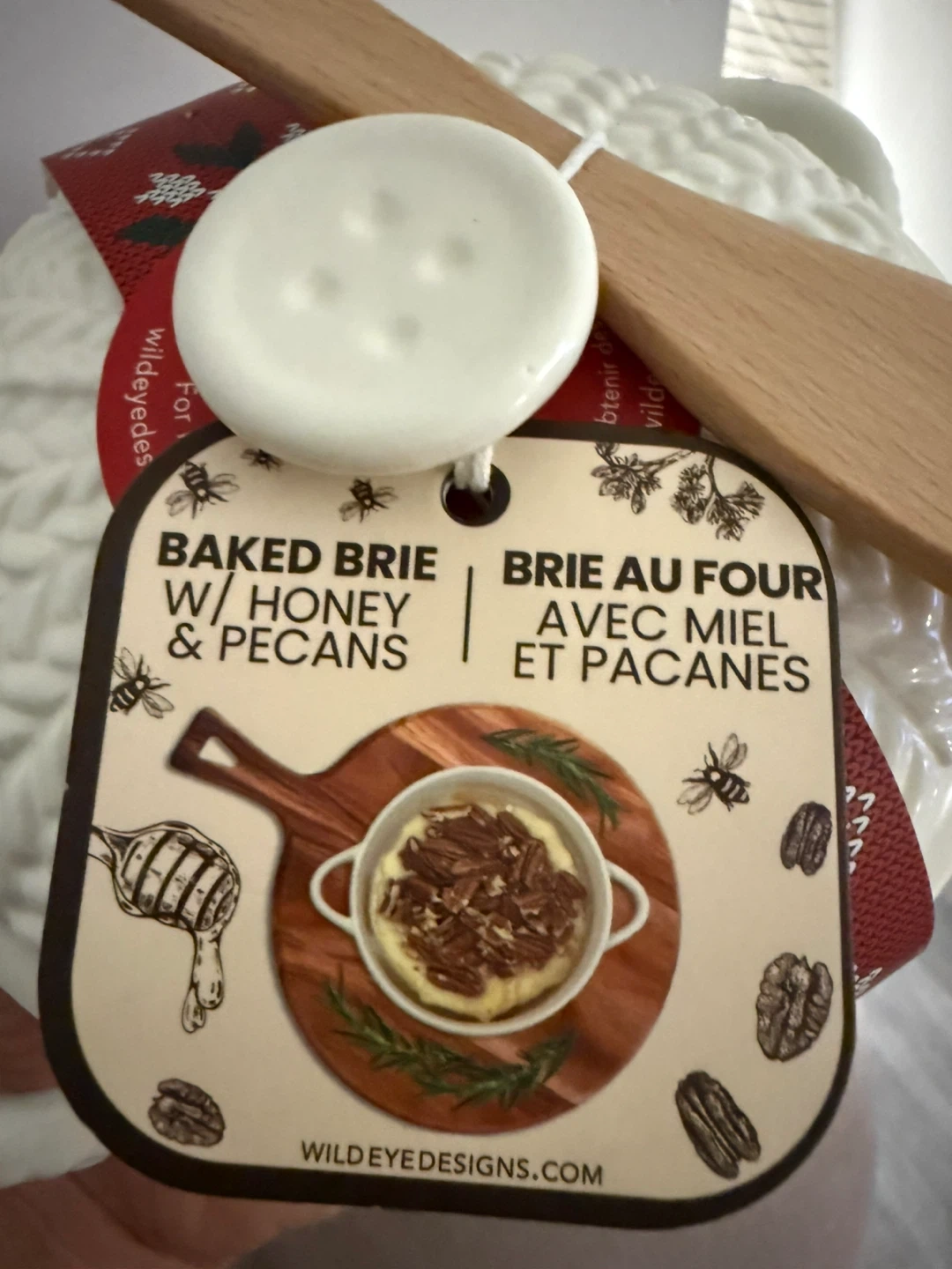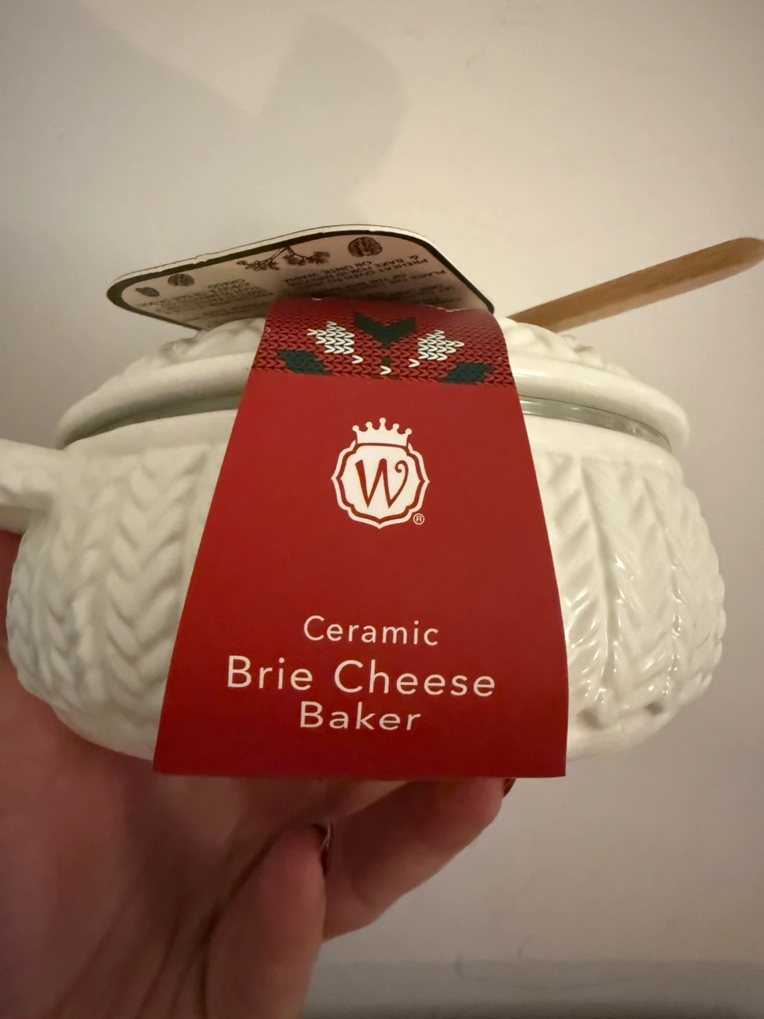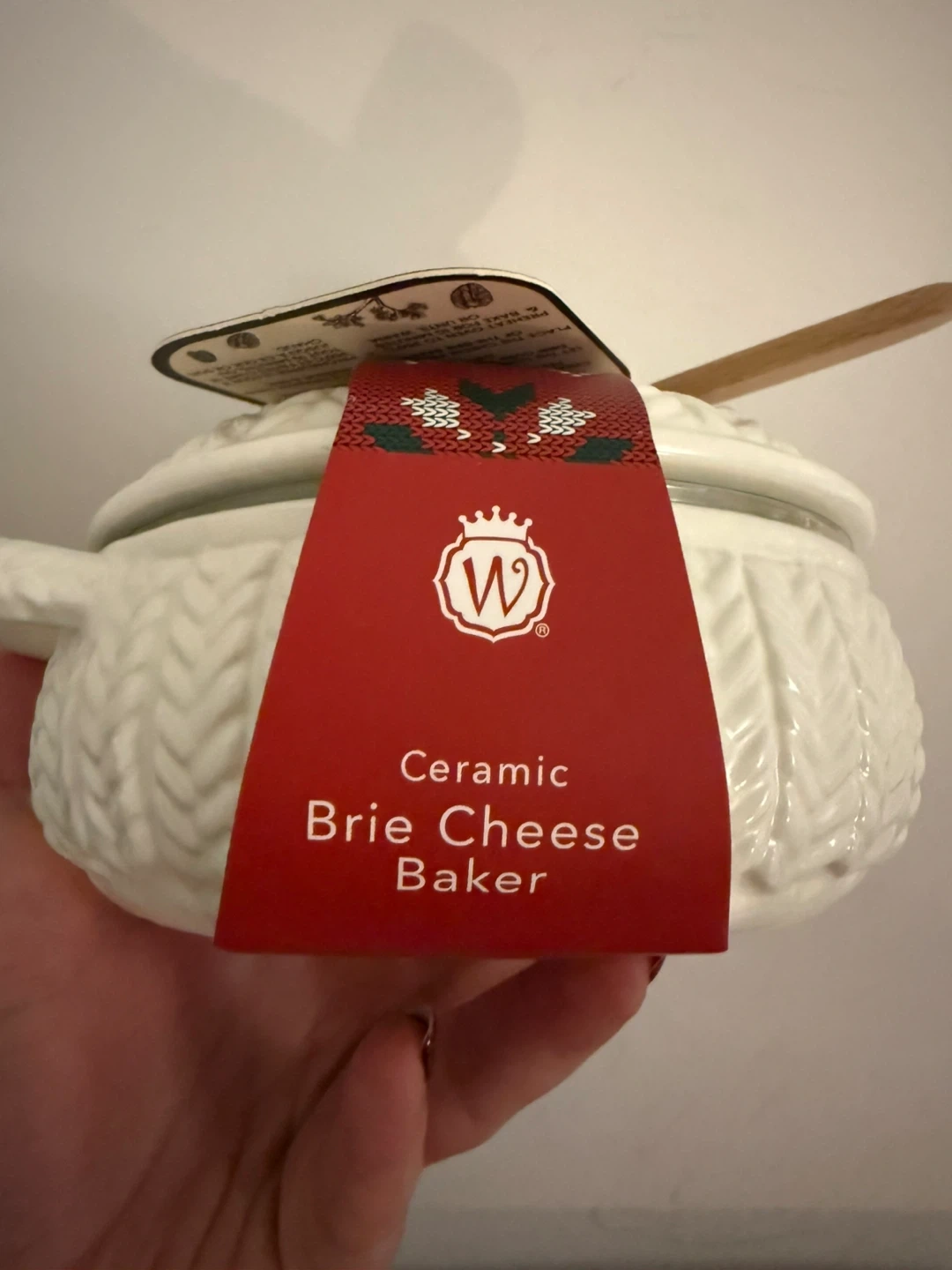 Ceramic brie cheese baker with a unique design. It’s brand new and comes with a wooden spreader. Perfect for serving warm brie! This baker is designed for use in the oven.
