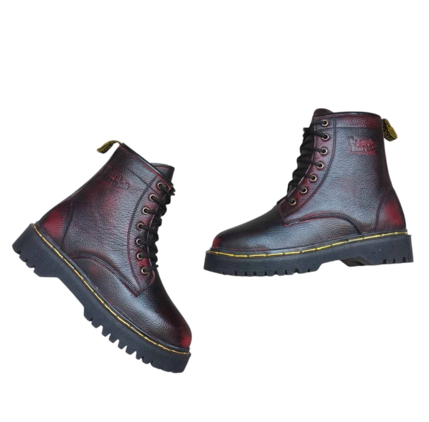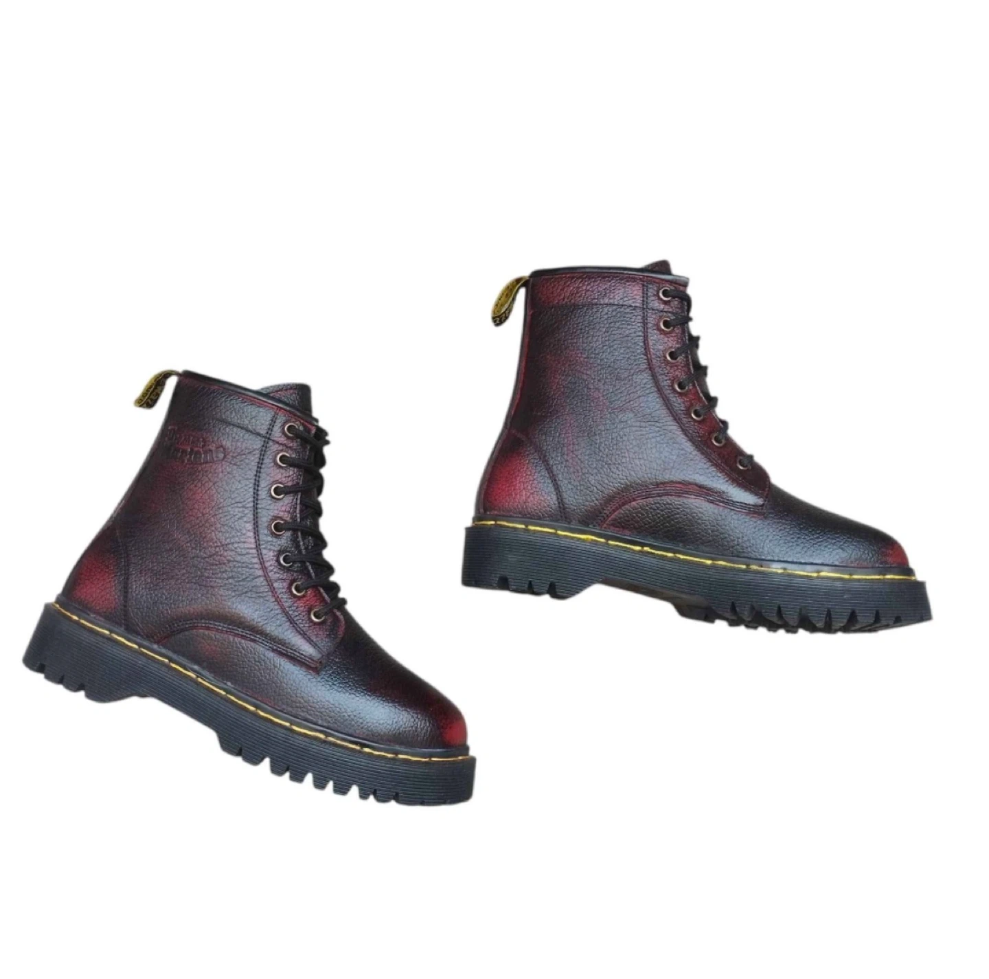 These Dr. Martens boots are a stylish burgundy colour and made of leather! They have a lace-up design and the classic yellow stitching around the sole. They look great and are ready for a new owner!