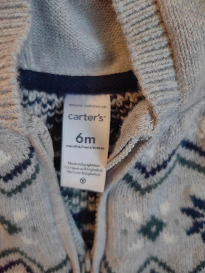 Here's a Carter's knit romper in size 6 months! It's a light grey colour with a cute patterned design and a hood. Perfect for keeping your little one cozy