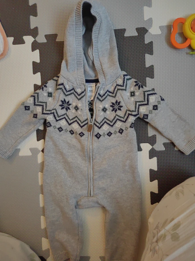 Here's a Carter's knit romper in size 6 months! It's a light grey colour with a cute patterned design and a hood. Perfect for keeping your little one cozy