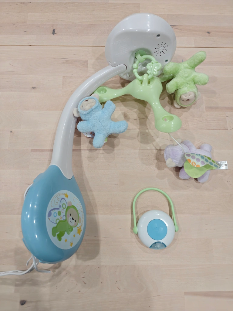 This Fisher-Price baby mobile comes with three plush toys: a monkey, a turtle, and a bear. It also includes a separate portable sound machine with a light. Great for soothing a baby to sleep.