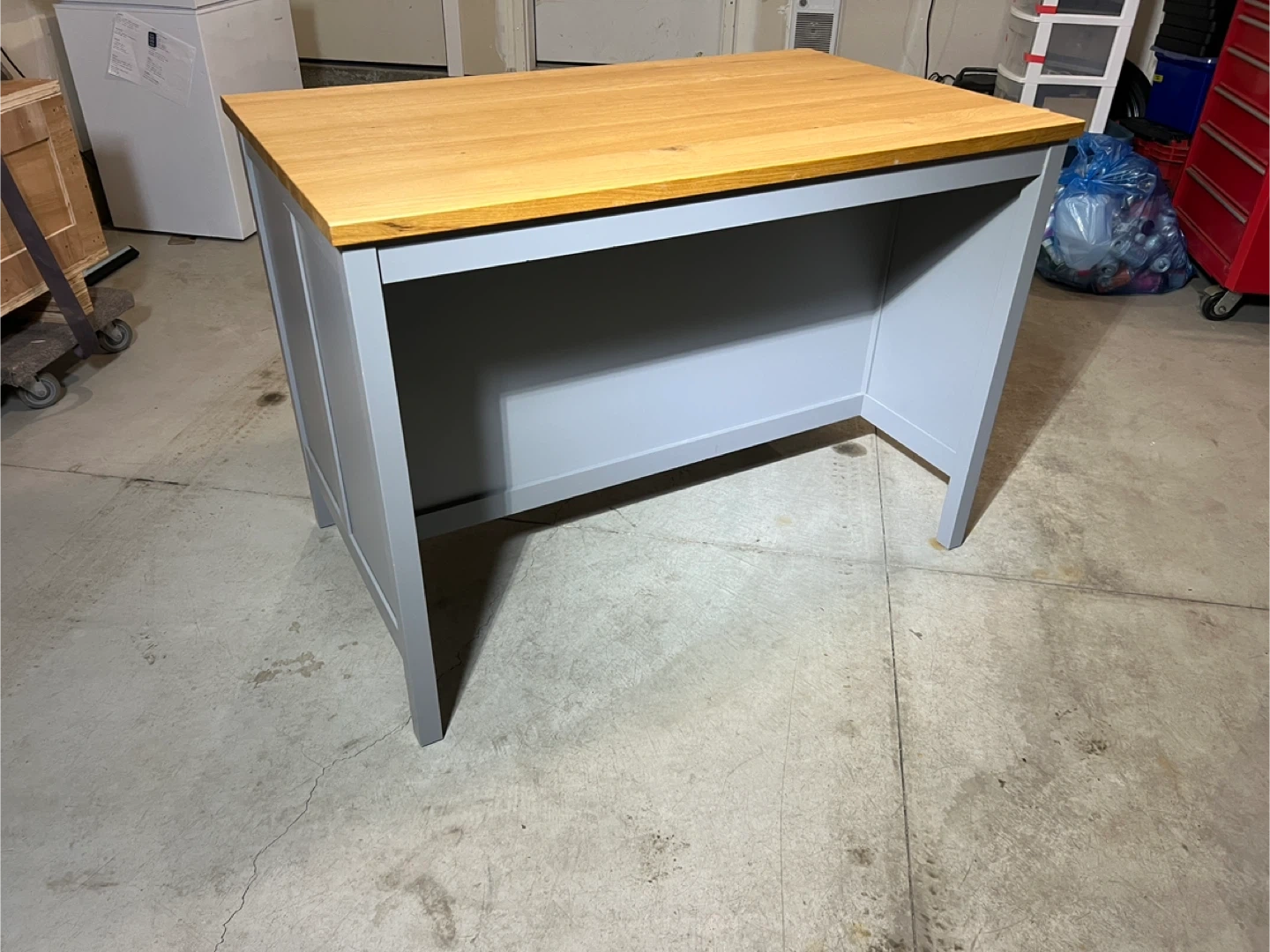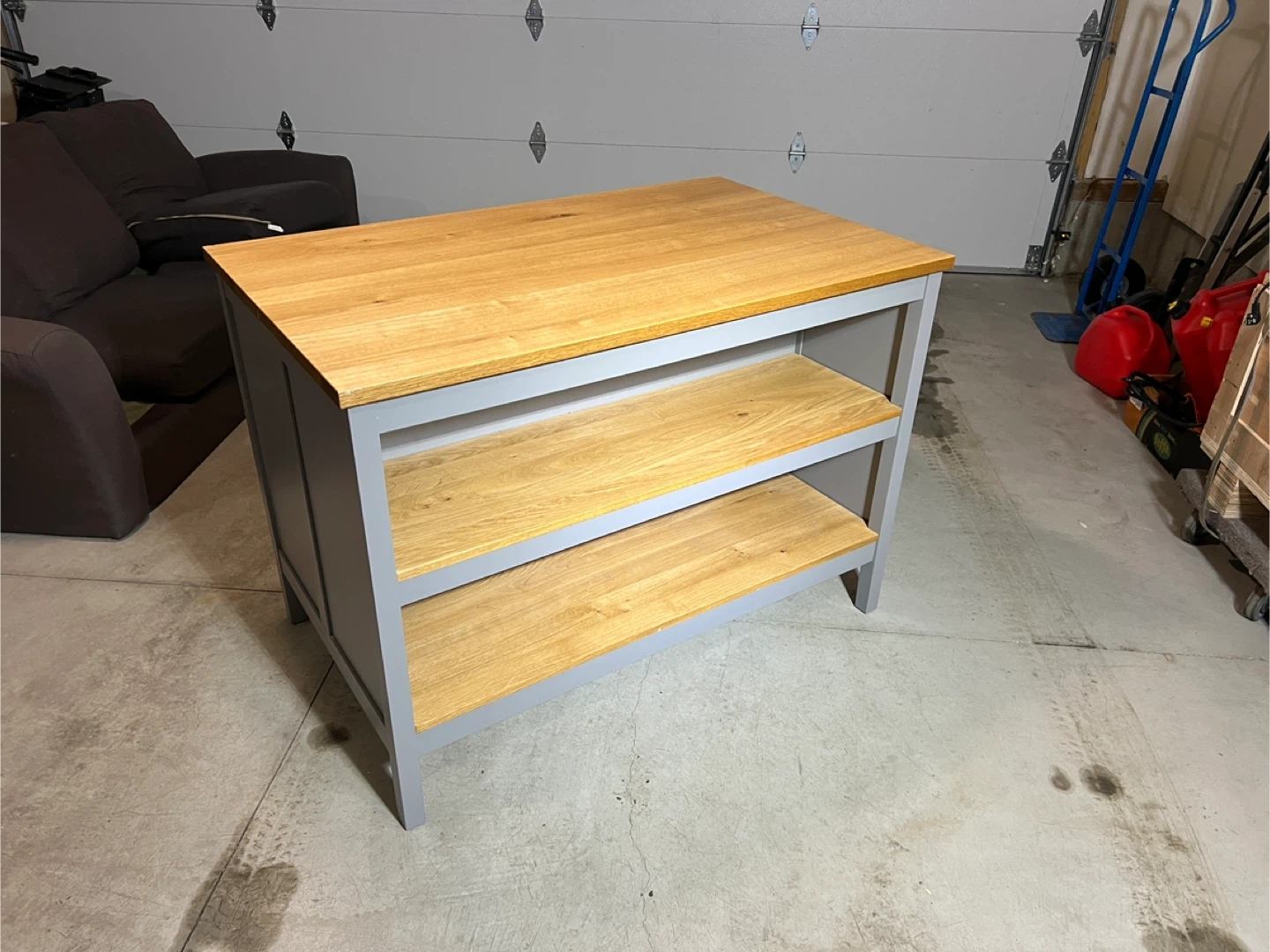 Wooden top island with grey base and shelves