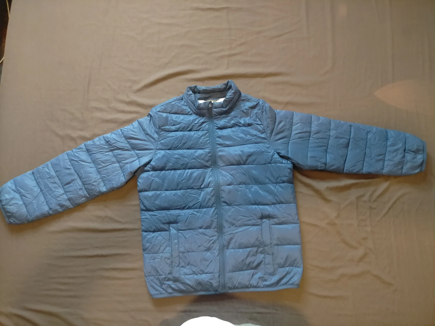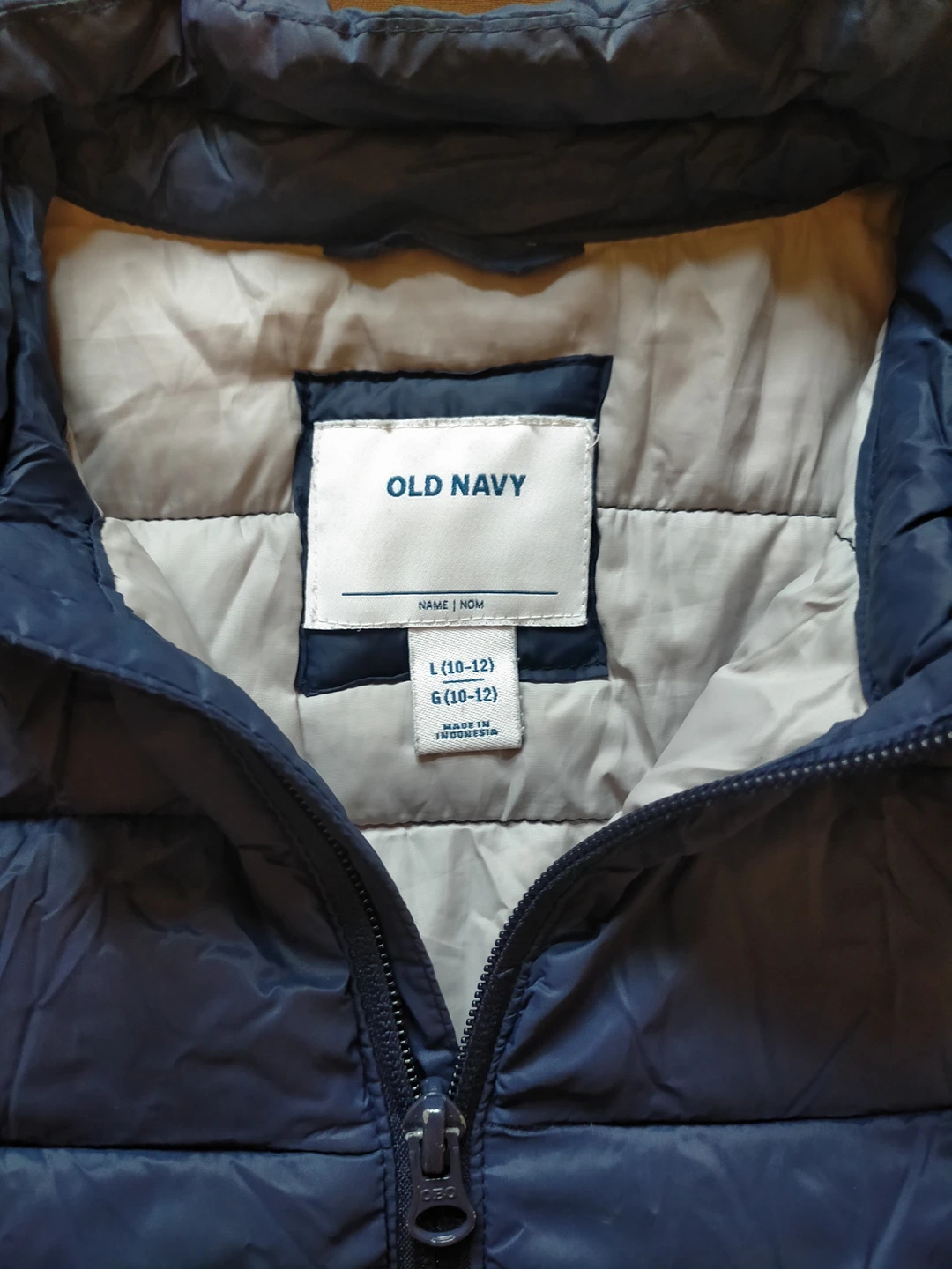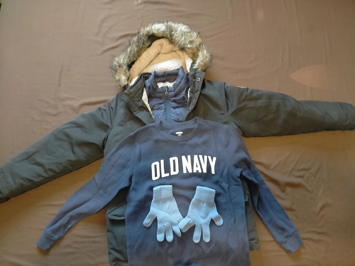 Winter jacket's zipper busted but has buttons to close or layer with the down jacket for extra warmth. (see photo) Comes with an ON warmer shirt boy's 10/12 and a pair of cloth gloves.