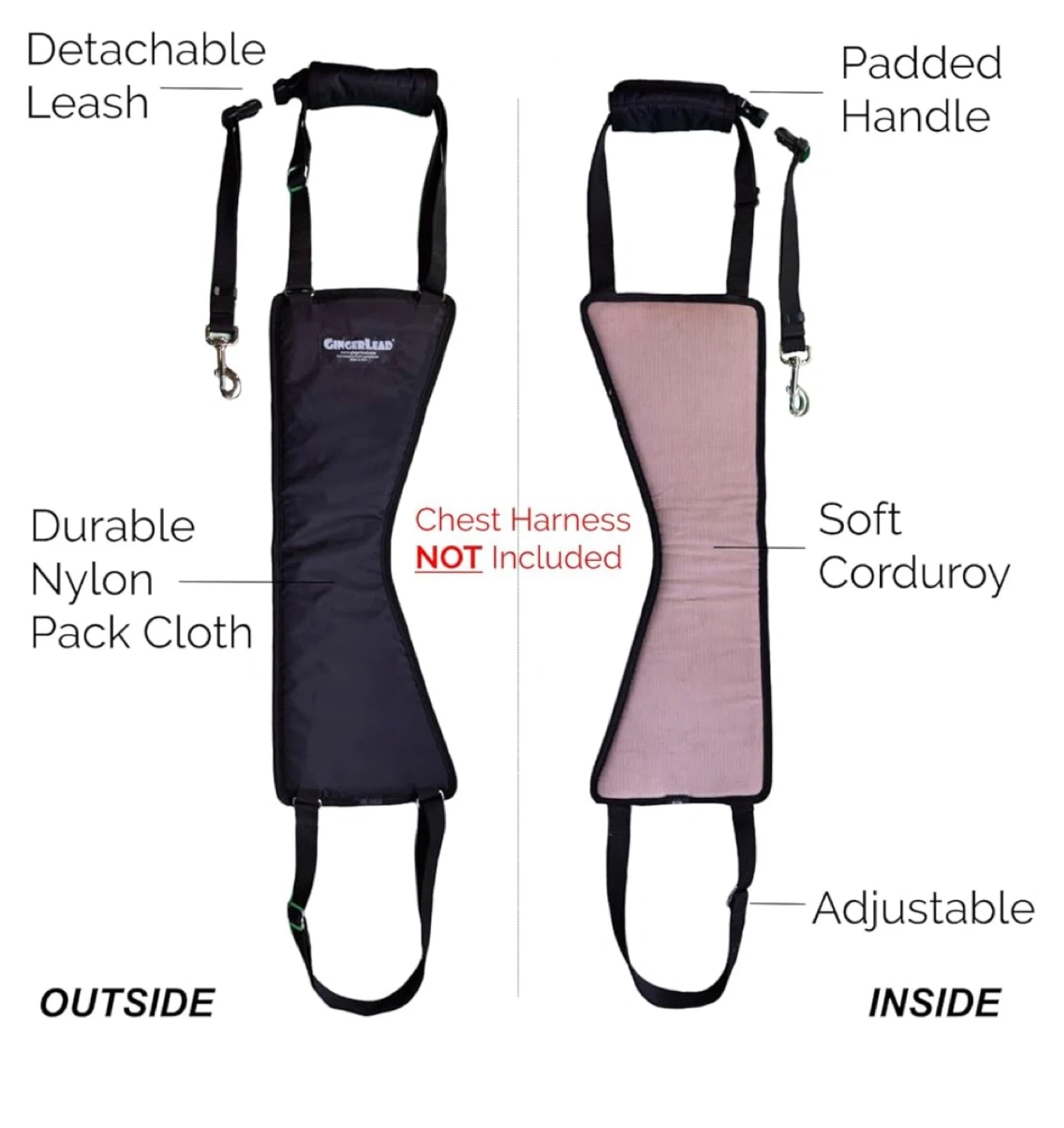 This dog lift harness is made from durable nylon pack cloth with a soft interior. It features a padded handle and adjustable straps. The pad width is 22.5 inches and it adjusts from 38-60 inches long. This harness is designed to help support dogs when walking or climbing stairs.