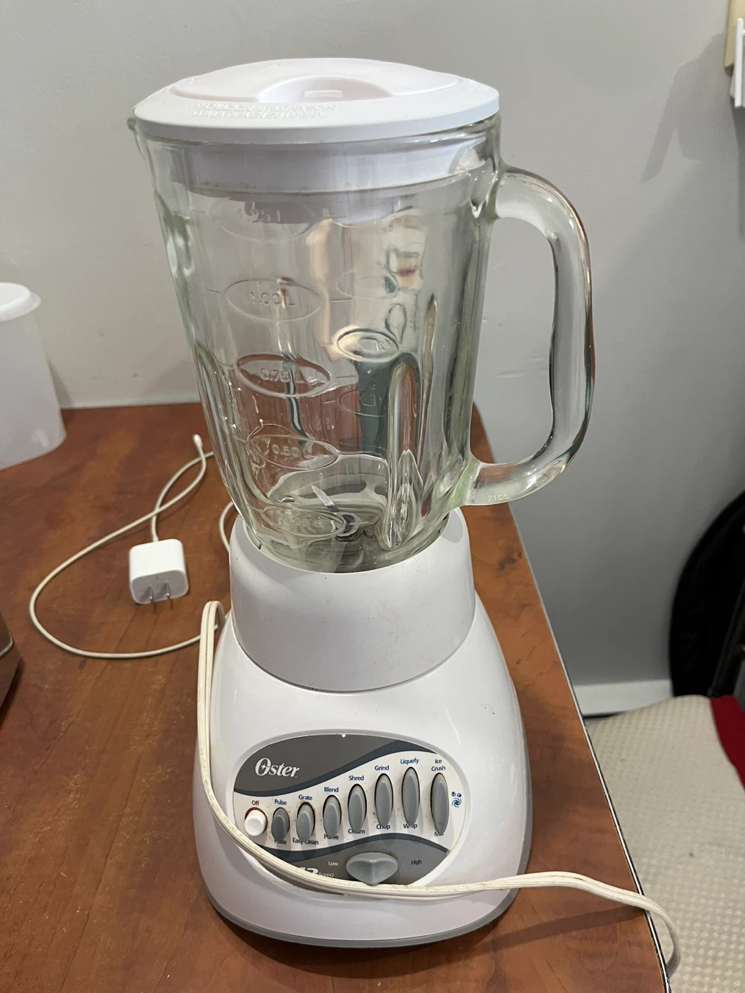 White Oster 12-speed blender with a glass pitcher. Features multiple blending settings including Liquefy, Blend, and Ice Crush. 12 speed settings available for versatile use.