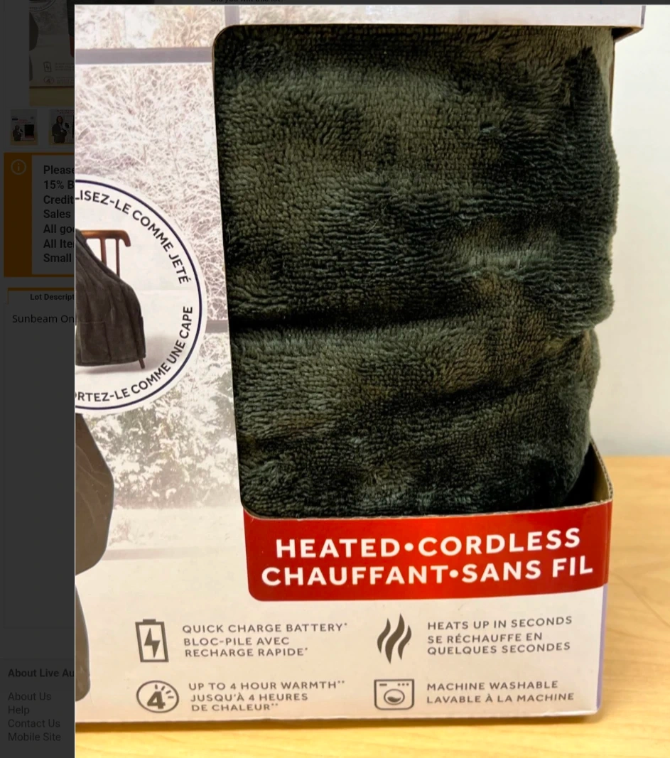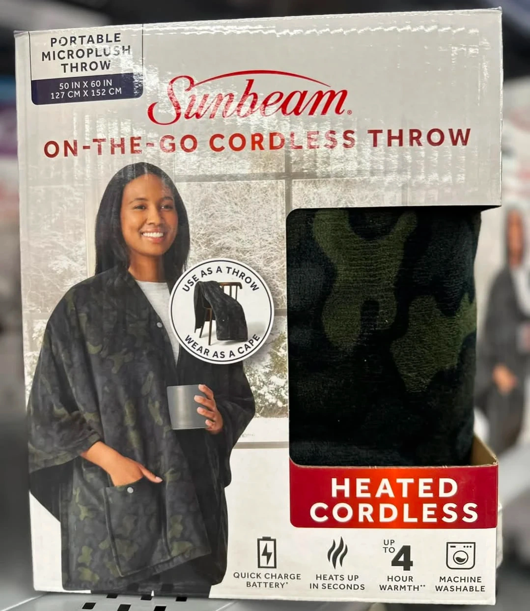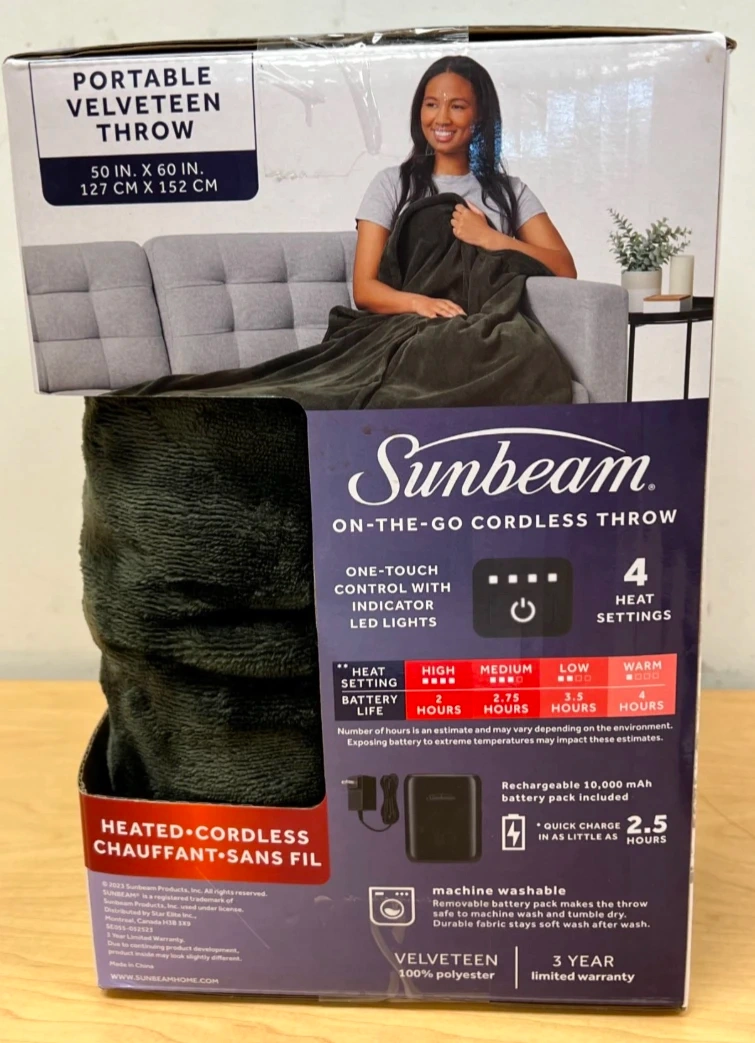 This Sunbeam On-the-Go cordless throw in camo pattern is made of 100% polyester microplush. It's machine washable with a removable battery pack. It was heating great, then I think the dog dug at the wires. Not sure if you can solder them back together or something, hence the competitive price. Still a cozy throw or poncho, and of course you get the original portable power bank which surely has many applications.