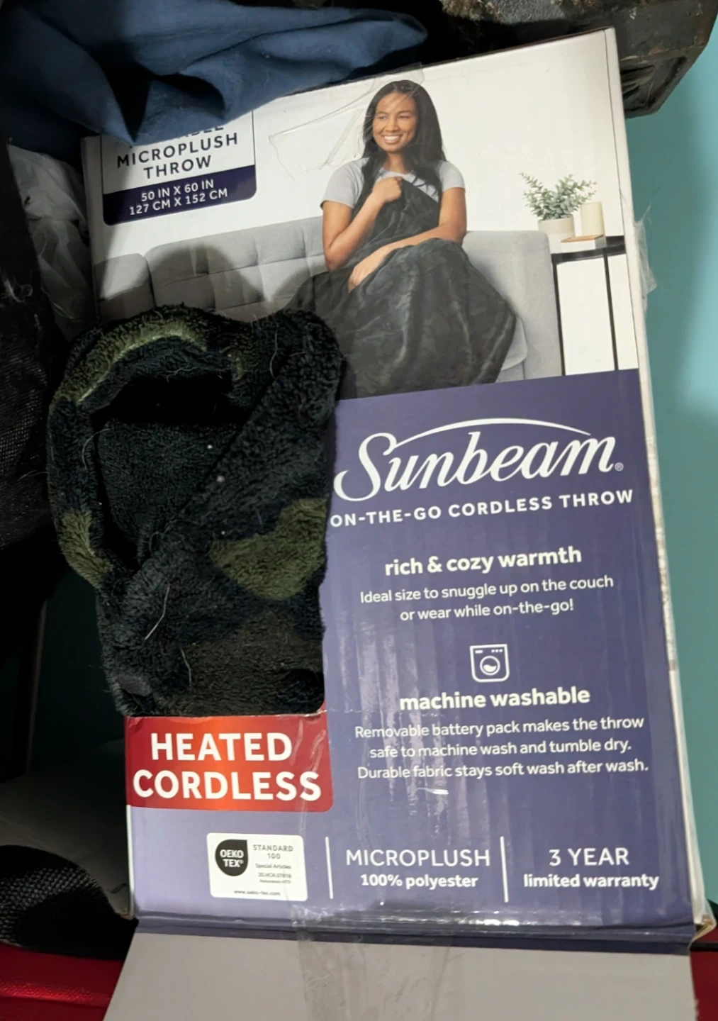 This Sunbeam On-the-Go cordless throw in camo pattern is made of 100% polyester microplush. It's machine washable with a removable battery pack. It was heating great, then I think the dog dug at the wires. Not sure if you can solder them back together or something, hence the competitive price. Still a cozy throw or poncho, and of course you get the original portable power bank which surely has many applications.