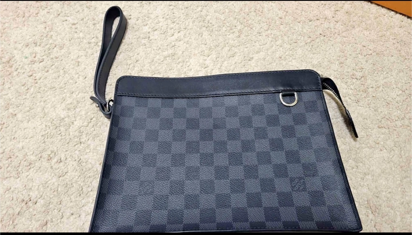 Authentic Louis Vuitton Pochette. Damier Graphite canvas. Black leather trim. Zip closure. Interior pockets. Includes dust bag and box. Made in France.